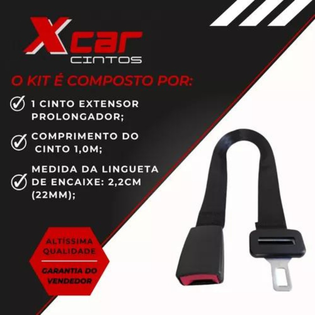 O Extensor para Cinto de segurança, é ideal para aumentar o tamanho do cinto. Extensor para gravidas COMPRIMENTO: 1,0M **Possui regulador de tamanho** MEDIDA DA LINGUETA: 2,2cm (22mm) **VERIFIQUE SE A LINGUETA DO SEU VEÍCULO MEDE 2,2CM ANTES DE COMPRAR**. Produto com foco em qualidade, resistência e durabilidade para uso automotivo. Para melhor desempenho, recomenda-se instalação por profissional qualificado. Características: Materiais dos componentes: Poliéster, Aço carbono temperado e ABS. 1 anos de garantia. Benefícios do uso do cinto de segurança: Reduz o risco de ferimentos graves em acidentes de trânsito. Mantém o corpo estabilizado, evitando o impacto contra o volante ou painel. Garante segurança e conforto durante a condução. Atende às normas de segurança veicular exigidas por lei. Evita multas e pontuação na CNH por uso incorreto. Indicado para todos os veículos: carros, caminhonetes e utilitários. Fácil instalação e reposição, ideal para manutenção preventiva. Custo-benefício alto, sendo essencial para a segurança automotiva. Recomendações: - Instalar com apoio de profissional qualificado. - Garantia de 6 meses.