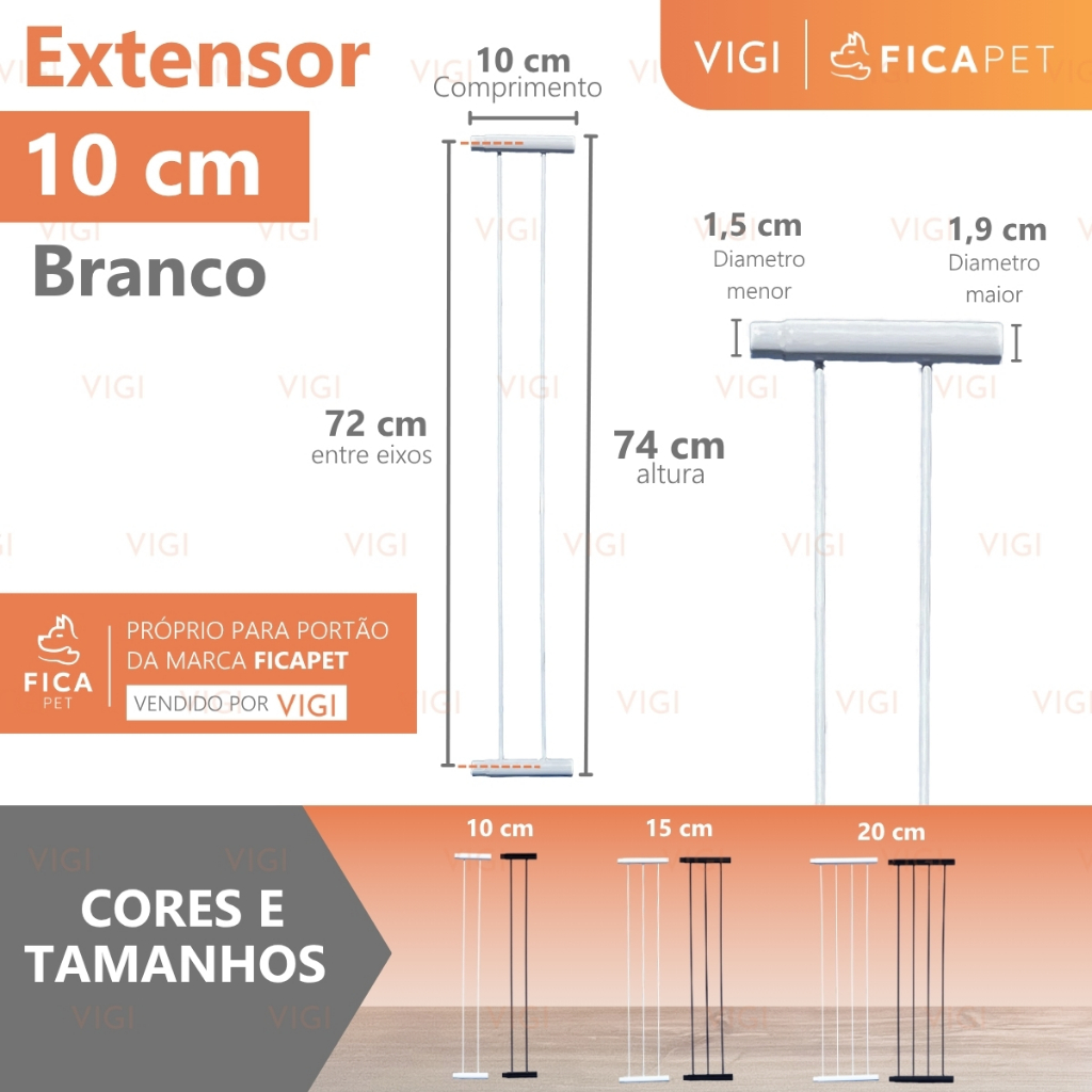 O extensor de 10 cm é ideal para adaptar o portão de segurança ao tamanho da sua passagem com mais facilidade. Compatível com os portões disponíveis em nossa loja, ele amplia a área de proteção sem comprometer a segurança e estabilidade do produto. Fabricado em material resistente com acabamento de qualidade, está disponível nas cores preto e branco para combinar com seu ambiente. Para garantir a compatibilidade, siga as instruções abaixo: 1. Retire os fixadores do seu portão; 2. Meça a distância entre os eixos dos fixadores superior e inferior: deve ser 72 cm; 3. Meça o diâmetro dos encaixes dos fixadores: 1,9 cm externo e 1,7 cm interno. Também disponível nas versões 15 cm e 20 cm (vendidos separadamente). Adapte seu portão com praticidade e segurança. Garanta já o seu extensor de 10 cm.