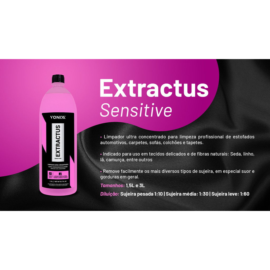 Extractus sensitive limpador ultra concentrado 1,5l vonixxExtractus sensitive é um limpador que todo profissional que atua com higienização de estofados precisa ter esse produto chegou como um complemento da linha vsc e foi desenvolvido principalmente para uso em tecidos mais delicados e de fibras naturais como seda, linho, lã e camurça, porque tem ph neutro em sua composição. Seu uso também é indicado para limpeza profissional de estofados automotivos, carpetes, sofás, colchões e tapetes. Sua fórmula contém tensoativos especiais que removem diversos tipos de sujeira nos tecidos mais sensíveis sem causar nenhum dano.DiluiçõesSujeira pesada 1:10Sujeira média: 1:30Sujeira leve: 1:60Uso recomendadoTecidos mais finos, linho, lã e camurça.Passo 1 do sistema vscLimpeza de estofados, carpetes e tapetes de tecidos sensíveisModo de usar1.Diluir o produto na proporção ideal de acordo com o nível de sujeira.2.Pulverizar uma fina névoa do produto, mantendo distância entre 20cm a 30cm da superfície, a fim de evitar encharcamento do estofado ou carpete.Aguardar 2 minutos.3.Utilizar escova macia e realizar a esfregação para auxiliar no desprendimento da sujeira.4.Realizar a extração ou aspiração sem enxágue.5.Realizar uma segunda extração, dessa vez com enxágue.Garantia do vendedor: 90 dias