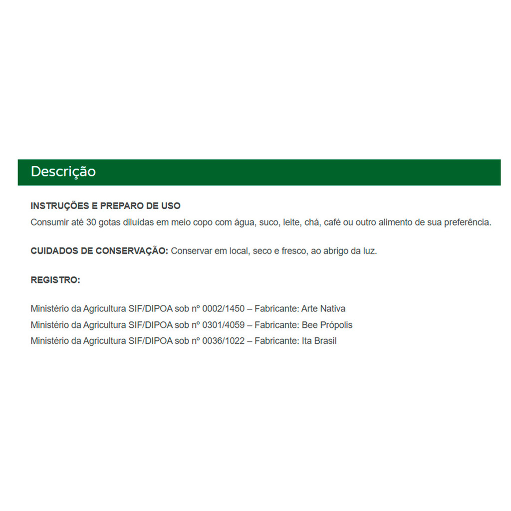 | Extrato de Própolis Arte Nativa 20 ml este produto | R$ 15,90 | 12% | 4.9/5 | 17 |