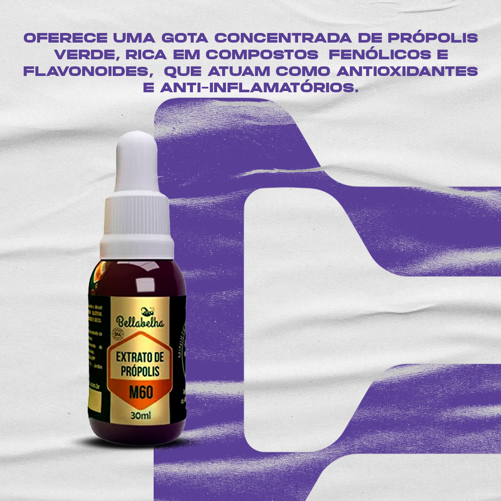 INFORMAÇÕES DE DESTAQUE M60: alta concentração de própolis em cada gota; Rico em compostos fenólicos e flavonoides; Extrato seco mínimo de 15%; Elaborado com própolis verde contendo Artepelin-C, um diferencial brasileiro; Forma líquida com conta-gotas prático; Embalagem plástica segura e resistente; Consumo diário recomendado: 30 gotas para adultos. DESCRIÇÃO O Extrato de Própolis M60 da BellaBelha é uma solução prática e concentrada para complementar sua rotina de cuidados com a saúde. Desenvolvido com própolis verde brasileiro, reconhecido mundialmente por sua qualidade, o produto possui alto teor de compostos fenólicos e flavonoides. A fórmula é apresentada em um frasco com conta-gotas prático, que facilita a dosagem diária. Sua embalagem plástica foi projetada para garantir a preservação do produto. Indicado para adultos, o Extrato de Própolis M60 pode ser diluído em mel, água ou suco, sendo uma opção versátil para o dia a dia. COMPOSIÇÃO Álcool de cereais e própolis verde. Não contém glúten; Armazenar em local seco e fresco. SUGESTÃO DE USO Diluir 30 gotas do extrato em mel, água ou suco, ou conforme a orientação de um médico ou nutricionista.