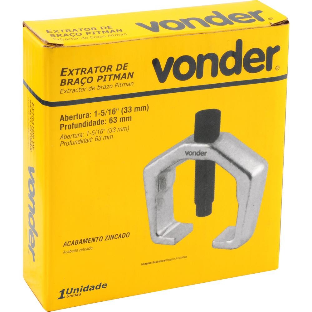 Ref.: do Fornecedor: 6510033063 Marca: Vonder Conteúdo da Embalagem: 1 Extrator Destaques e diferenciais: Adapta-se a maioria dos veículos. Possui acabamento zincado, que proporciona resistência à oxidação/corrosão. Aplicações e dicas de uso: Indicado para extração de braço pitman. Abertura de 33 mm e fuso de 63 mm. Características Técnicas: Material: Aço carbono Massa aproximada: 438 g