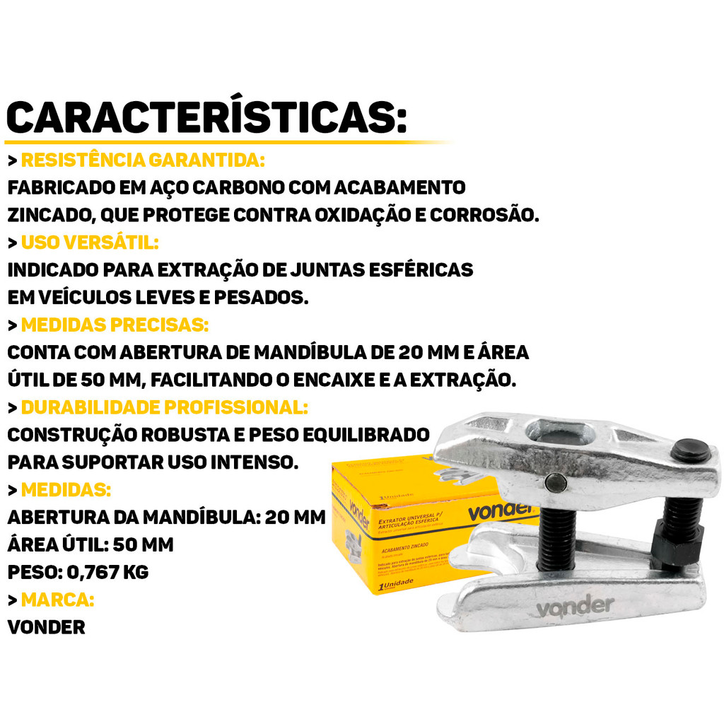 Extrator Universal Para Articulação Esférica Vonder O Extrator Universal da marca Vonder é uma ferramenta essencial para profissionais que necessitam de precisão na extração de articulações esféricas. Fabricado com materiais de alta resistência, oferece longa durabilidade e excelente desempenho. Seu design universal permite o uso em diversos modelos de veículos, eliminando a necessidade de múltiplas ferramentas. Características: > Compacto e fácil de manusear; > Garante durabilidade e resistência; > Indicado para extração de juntas esféricas, para todos os tipos de veículos; > Possui acabamento zincado, que proporciona resistência à oxidação/corrosão; > Seu design inteligente permite que você trabalhe em espaços apertados com facilidade, tornando-o uma ferramenta versátil para uma variedade de tarefas Especificações Técnicas: > Material: aço carbono; > Peso aproximado: 767g; > Abertura de mandíbula: de 20mm e área útil de 50mm. - Marca: Vonder - Garantia: 90 dias contra defeitos de fabricação Vantagens de comprar na Brester: - Produto a pronta entrega. - Produto novo, com garantia de fábrica. - Nota fiscal para Pessoa Física e Pessoa Jurídica.