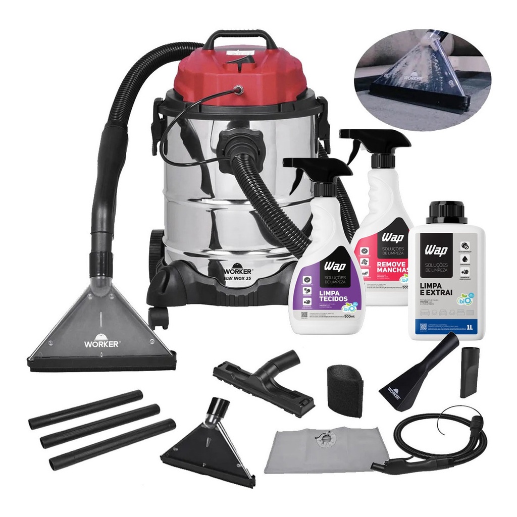 Extratora Profissional Carpet Cleaner Pro 25 Worker com Removedor de Manchas + Limpa Tecidos Indicada para limpeza de pisos, estofados, sofás, carpetes, cadeiras, entre outros. - Aspira pó e líquidos: Flexibilidade para limpeza rápida. - Rodas com proteção contra impactos. - Reservatório inox 25 litros com filtro. - Estrutura reforçada e tanque de inox, maior resistência e durabilidade. - Conta com porta acessórios para melhor organização e transporte, enrolador de cabo elétrico que facilita o armazenamento do produto, além de motor com dupla isolação, que garante maior segurança ao operador. Itens Incluso: - 1 Bico para Limpeza - 1 Bico Multiuso - 1 Bico para Cantos - 1 Bico pequeno para limpeza; - 1 Saco para Pó Lavável - 1 Mangueira Flexível - 3 Tubos Extensores Código: 163227 / 163235 - Marca: Worker - Tensão: 127v ou 220v ( Escolher conforme Disponibilidade). - Potência Nominal: 1.400W - Frequência: 60Hz - Conforme Portaria 371 de 29/12/2009 Inmetro - Vácuo: 160 Mbar - Capacidade total do recipiente: 25 Litros - Capacidade útil: Pó 20L - Líquido 16 Litros - Comprimento do Cabo de Alimentação: 4 Metros - Nível de Ruído: 98 Db(A) - Fabricado na China. Dimensões Aproximada do Produto: - Altura: 550mm - Largura: 380mm - Comprimento: 420mm - Peso: 6,0 Kg Limpador Concentrado Baixa Espumação para Extratoras Limpa e Extrai 1 Litro Wap O WAP LIMPA E EXTRAI é um Limpador Concentrado de Baixa Espumação, indicado para o uso em Extratoras WAP para a limpeza de sofás, cadeiras, poltronas, estofados automotivos, colchões, tapetes e carpetes. Sua fórmula com pH neutro, protege você, a superfície, a extratora e o meio ambiente. Por isso, enquanto você cuida da limpeza, também está cuidando da natureza. O Detergente para Extratoras WAP LIMPA E EXTRAI é altamente eficiente na remoção das sujeiras, renovando e perfumando o ambiente com uma sofisticada fragrância de cereja e avelã. Encontre o Limpa e Extrai da WAP nas versões de 1L e 5L, indicado para limpezas residenciais e profissionais. O uso deste produto somado às potentes Extratoras WAP desempenha um incrível resultado de limpeza, além de render muito mais, graças à sua fórmula concentrada que deve ser diluída em água. Soluções de Limpeza e Cuidado com o Ambiente: É WAP! - Detergente limpador para uso em Extratoras. - Pode ser inserido dentro da extratora e não produz espuma. - Indicado para a limpeza de sofás, cadeiras, poltronas, estofados automotivos, colchões, tapetes e carpetes. - Formulado com antiespumante, o Limpa e Extrai oferece facilidade e segurança na hora da limpeza, pois além de não travar a extratora, evita o risco de queima do motor. - Possui pH neutro que preserva as fibras do tecido e as peças da extratora, evitando a corrosão e aumentando sua vida útil. - Seguro para ambientes com crianças e pet. - Altamente biodegradável, causando menos impacto ambiental. - Produto concentrado e com alto rendimento, devendo ser diluído de acordo com o grau de sujidade. - Fragrância Cereja e Avelã: Renova e perfuma o ambiente com uma sofisticada fragrância. Ambiente limpo e cheiroso. Referencia: 5231 - Código: CP3201 - Marca: Wap - Conteúdo: 1 Litro - Composição Química: Tensoativo não iônico, tensoativo aniônico, antiespumante, neutralizante, fragrância, conservantes e veículo. - Ação: O Limpa e Extrai é um limpador concentrado de baixa espumação, indicado para o uso em Extratoras WAP. Ele é altamente eficiente na remoção das sujeiras, renovando e perfumando o ambiente com uma sofisticada fragrância de cereja e avelã. - Onde Aplicar: Sofás, cadeiras, poltronas, estofados automotivos, colchões, tapetes e carpetes. - Tipo de Limpeza: Sujeiras orgânicas em tecidos como poeira, poluição e gordura do corpo. - Indicação de Uso: Profissional e doméstico. - Características: Concentrado; Sem espuma; pH neutro (7,0) ; Biodegradável; Incolor; Sem necessidade de enxágue imediato. - Fragrância: Cereja e Avelã - Segurança: Não tóxico; Não danifica e não oxida o equipamento; Não corrosivo. Diluição para 1 Litro: - GRAU DE SUJIDADE ALTA: 35 ml produto + 965 ml de água - GRAU DE SUJIDADE MÉDIA: 25 ml do produto + 975 ml de água - GRAU DE SUJIDADE BAIXA: 15 ml de produto + 985 ml de água Medidas Aproximadas da Embalagem: - Altura: 192mm - Largura: 75mm - Comprimento: 105mm - Peso: 1.090 Kg *** VALIDADE: 24 Meses - A partir da data de fabricação indicada na embalagem, se estiver em embalagem fechada. *** Removedor de Manchas e Sujeiras de Tecidos Remove Manchas 500ML WAP O WAP REMOVE MANCHAS atua nas manchas mais resistentes em tecidos, proporcionando um excelente resultado. Este produto está pronto para ser utilizado em estofados, tapetes, carpetes e tecidos, trazendo uma ação profunda e um agradável frescor de limpeza. Sua fórmula de base vegetal é 100% biodegradável e não deixa resíduos. Em apenas 18 dias é totalmente absorvida pela natureza, causando menos impacto ambiental. Por isso, enquanto você cuida da limpeza, também está cuidando da natureza. - Remov