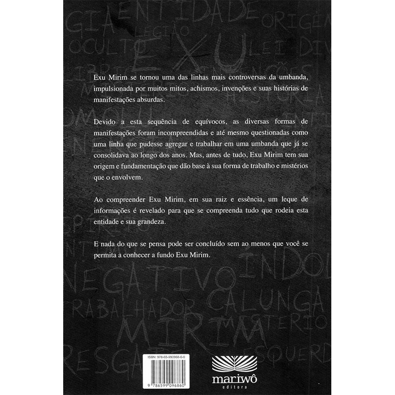 Autor: Tuco Borella - Gênero: Umbanda - Páginas: 158 - Tamanho: 16,00 x 23,00 - Sinopse: Exu Mirim se tornou uma das linhas mais controversas da umbanda, impulsionada por muitos mitos, achismos, invenções e suas histórias de manifestações absurdas. Devido a esta sequência de equívocos, as diversas formas de manifestações foram incompreendidas e até mesmo questionadas como uma linha que pudesse agregar e trabalhar em uma umbanda que já se consolidava ao longo dos anos. Mas, antes de tudo, Exu Mirim tem sua origem e fundamentação que dá base à sua forma de trabalho e mistérios que o envolvem. Ao compreender Exu Mirim, em sua raiz e essência, um leque de informações são reveladas para que se compreenda tudo que rodeia esta entidade e sua grandeza. E, nada do que se pensa pode ser concluído sem ao menos que você se permita a conhecer a fundo Exu Mirim.