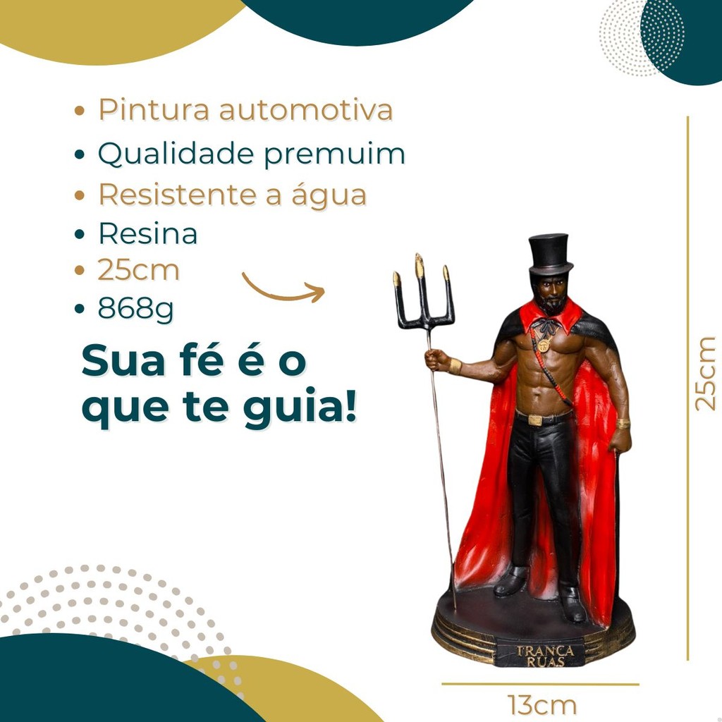 Seja Bem-vindo(a) a Studio Orion! *PRODUTOS A PRONTA ENTREGA COM NOTA FISCAL, COMPRANDO ATÉ AS 14:00 ENVIAMOS NO MESMO DIA* TODOS OS NOSSOS ENVIOS POSSUEM SEGURO E QUALQUER PROBLEMA COM O PRODUTO RECEBERÁ SEU DINHEIRO DE VOLTA SEM BUROCRACIA. IMAGEM ESTÁTUA EXU TRANCA RUAS EXCLUSIVA STUDIO ORION Dimensões: 26cm (altura) x 13cm (largura) x 10cm (comprimento) APROXIMADAMENTE. -Fabricado em resina poliéster de alta qualidade e resistência. - Produto artesanal, pintado à mão, portanto pode ocorrer variações na tonalidade das cores. - Produto de alta qualidade. DUVIDAS FREQUENTES -Consigo mudar a pintura da imagem? Não, nós não fazemos cores personalizadas. Temos cores padronizadas disponíveis em nosso catálogo. -Vocês tem imagens em escalas maiores? Não, infelizmente não fazemos tamanhos maiores. Temos um limite definido para o tamanho dos produtos que oferecemos. -A imagem está disponível para pronta entrega? Sim, temos pronta entrega. Nossos produtos estão disponíveis imediatamente para envio. Assim que o seu pedido for confirmado, faremos o envio o mais rápido possível para que você receba sua compra rapidamente. Se tiver alguma dúvida específica sobre a disponibilidade de um produto em particular, por favor, informe-nos e teremos prazer em ajudar. -Minha compra é segura? A segurança da sua compra é uma prioridade. Todas as transações no marketplace são processadas em um ambiente seguro. Isso garante que, se por acaso o seu produto não for entregue, o marketplace reembolsará o valor integral da sua compra. -Prazo de entrega? Nossos produtos são despachados pelo marketplace com envio imediato após a confirmação do pagamento. O tempo estimado de entrega está disponível no próprio anúncio. Entrega flex para São Paulo capital, ENTREGA NO MESMO DIA. -É possível colocar mais de um item na mesma compra? Sim, basta clicar em: VER MAIS DADOS DESDE VENDEDOR > MAIS ANÚNCIOS DESTE VENDEDOR > VER TODOS Caso não encontre esta opção nos enviei uma pergunta e nós enviamos o link do anuncio desejado. Fornecemos a melhor experiencia de compra. Experimente! QUER SE TORNAR UM REVENDEDOR DA NOSSA LINHA EXCLUSIVA? TEMOS PREÇOS ESPECIAIS PARA VOCÊ! Somos uma distribuidora de artigos religiosos da grande São Paulo! Temos imagens exclusivas, incensos, banhos e muito mais para você!!!