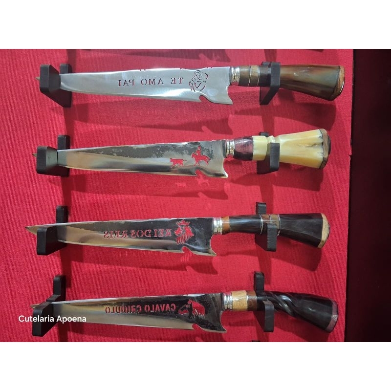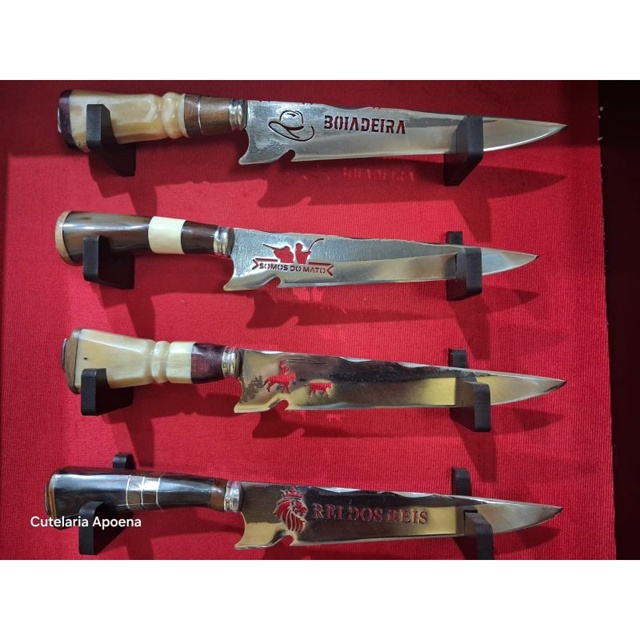 Cutelaria Apoena líder em vendas de facas na Shopee ATENÇÃO: Valor promocional de R$79,99 para as primeiras compras até o anúncio ter vendas e aumentar a visibilidade na plataforma, após isso volta ao preço normal de mercado. Facas Artesanais Temáticas com Dessnhos VAZADOS 🔪 Corte perfeito para a sua 🥩🍖 Facas que unem o contemporâneo com o que têm de mais moderno na cutelaria. Quem compara com certeza compra as nossas facas. O que nossas facas têm que as outras não têm? *Lâminas cortadas a laser *Aço carbono 1070 *Botão de alumínio *Mosqueados no dorso *Abridor de garrafa *Cabos diferenciados *Polimento premium *Bainha em couro NATURAL Facas diferenciadas, pode procurar a vontade, nossas facas são exclusivas. Legítima faca campeira, para lida no campo, cozinha, churrasco... Ótimas para presentear Tamanhos de 8,8 polegadas de lâmina (23cm) mais os cabos que medem cerca de 12cm Total da faca média de 35cm Grande acervo, compre sem medo, tenha certeza de adquirir um produto único e de ótima qualidade. AGORA COM BAINHA PADRONIZADA CORTADAS, COSTURADAS, FURADAS E PINTADAS TUDO A MÃO, 100% ARTESANAL. SOMENTE UMA BAINHA DESSAS ESTÁ SENDO COMERCIALIZA A MAIS DE R$30,00 NO MERCADO. Acompanham bainha em couro ou caixa em MDF com preenchimento em palha ou suporte conforme a foto do anúncio com gravação da logo da nossa cutelaria. ATENÇÃO: Após a compra nos informe qual das duas opções a ser enviado ou BAINHA EM COURO ou CAIXA DE MDF, não enviamos as duas opções ou é uma ou outra. Os modelos enviados serão exatamente os das fotos segundo a variações escolhida no anúncio. Envio em até 24 hrs após aprovada a compra e definido os modelos e liberada a etiqueta de envio Cabos variados de chifre e osso e chifre e osso misto com madeira nobre, madeira nobre imbuía, roxinho, ipê, guajuvira... Faca Artesanal não é tudo igual, compre com quem têm tradição no ramo da cutelaria e não se decepcione melhor preço e a melhor qualidade é aqui. Qualquer dúvida entre em contato conosco temos uma equipe especializada para melhor lhe atender, estamos a disposição. Cutelaria Apoena a sua melhor opção em facas. Agradecemos a visita e boas compras!