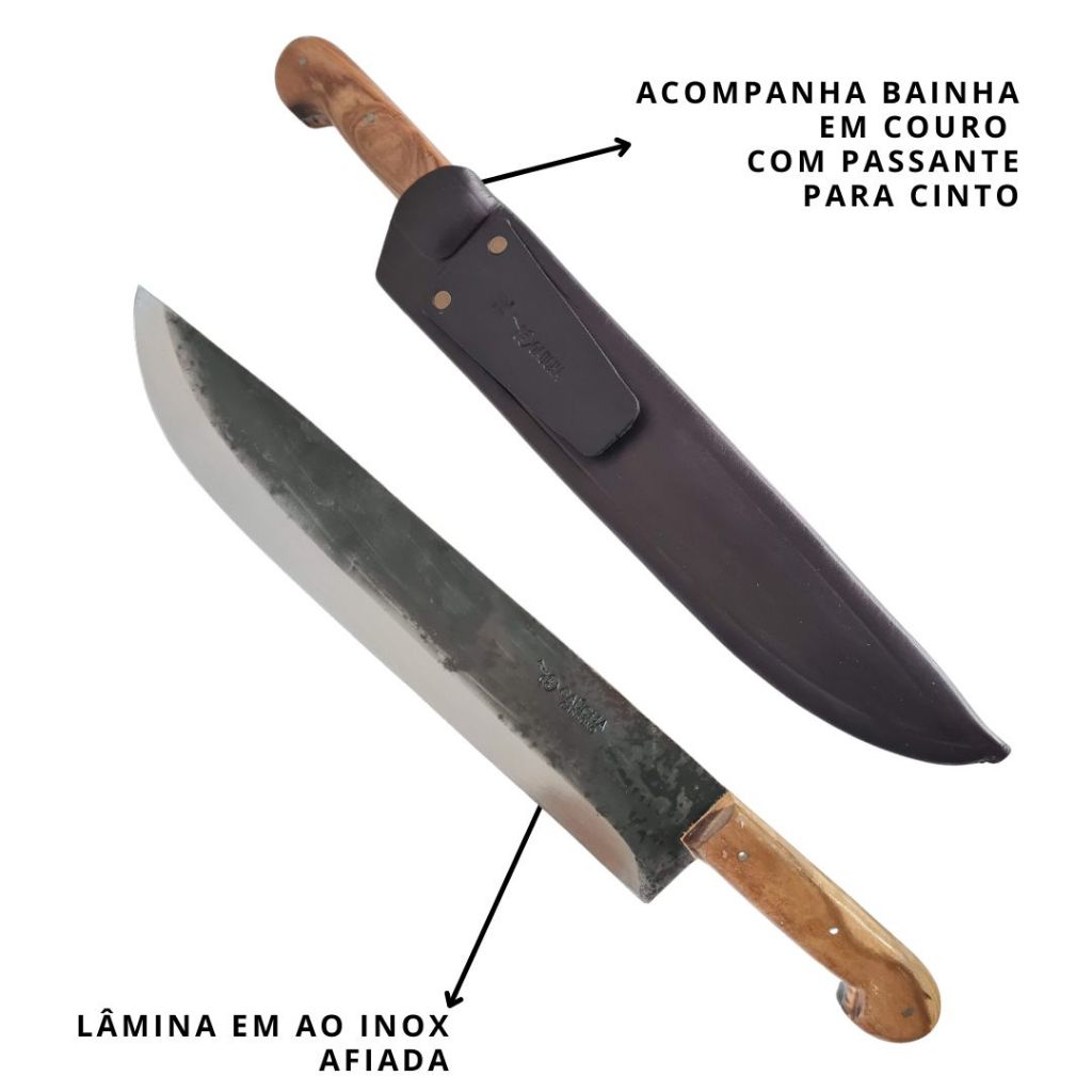 Melhor Faca Churrasco Gaúcha Artesanal! FACA CHURRASCO 12 POLEGADAS Somos uma empresa distribuidora e fabricante de produtos para canais na internet. Sim prezamos em fornecer produtos que tragam satisfação, qualidade e bem estar aos nossos amigos clientes. Esta faca pode ser usada em cortes de carne, no churrasco, na cozinha, uso geral. O seu corte é em extremo afiado. Para a afiação utilizar a chaira sempre que for guardar a faca, ou seja, após o uso. Possui Doze polegadas que possibilita cortes desde peças maiores até as menores. O material do cabo é feito manualmente com materiais naturais. Bainha feita em couro para transporte e proteção. O material da lâmina em aço carbono possibilita uma dureza maior possibilitando uma durabilidade maior do corte. O material empregado na lâmina enferruja. A afiação é feita manualmente. Seu uso é para cortes e não para quebrar ossos ou galhos. Se pensa em presentear e ideal. Informações técnicas: Faca Churrasco Gaúcha Artesanal Garantia : 90 dias/ Peso 315g Cor: Inox Cabo: Madeira . Dimensões da faca: 44cm (c) x 3, 5 cm (A) Dimensões da bainha : 30 cm (C) x 4cm (A). Espessura lâmina : 3 mm Comprimento da lâmina : 30 cm Material da lâmina : Aço Carbono 1070 com exímio tratamento térmico trazendo corte excepcional, leveza, durabilidade. Faca feita artesanalmente no Brasil- Rio Grande do Sul. Ideal para cortes de carnes. Churrasco. Afiação feita manualmente. Possibilitando durabilidade no fio de corte. Bainha artesanal feita de couro. Faca Churrasco Gaúcha Artesanal