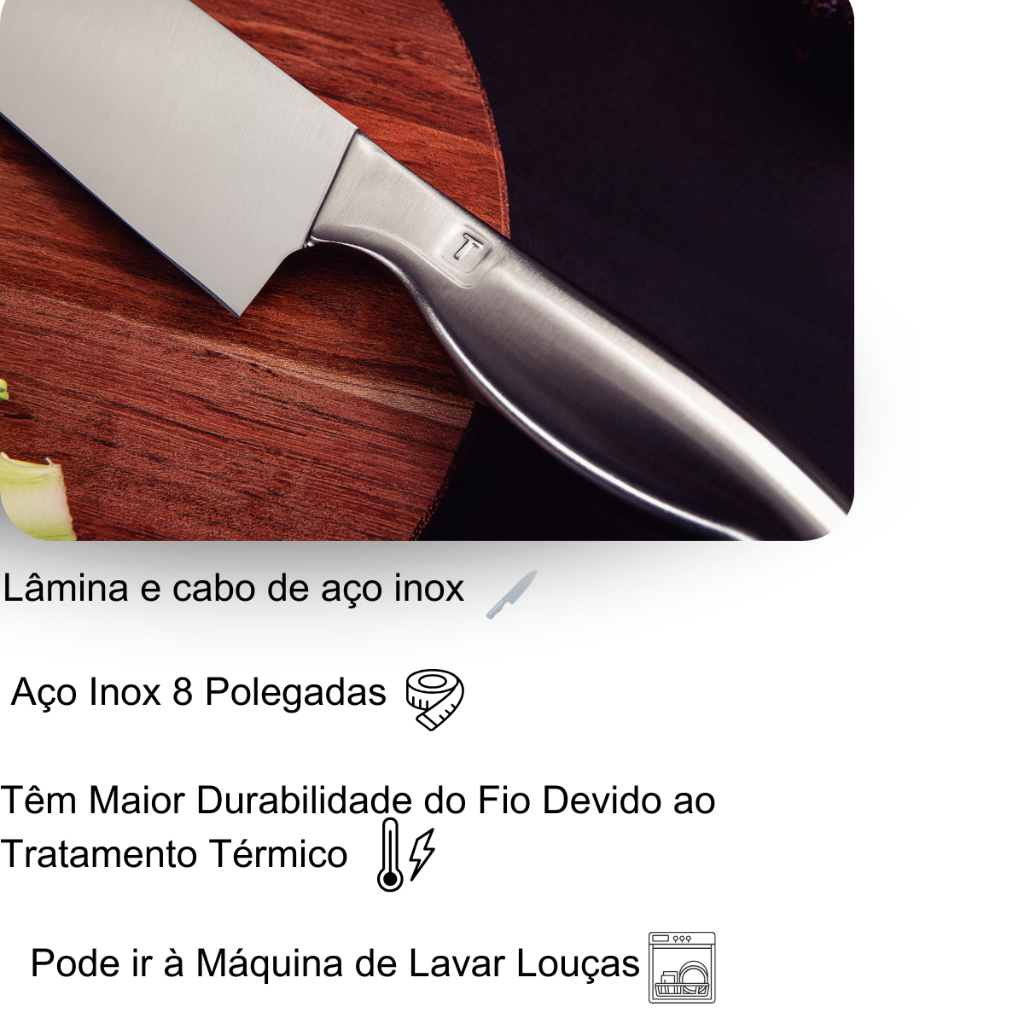 Faca Chef Tramontina Personalizada Sublime 8" Aço Inox – Versatilidade, Durabilidade e Personalização A Faca Chef Tramontina Personalizada Sublime 8 polegadas é a escolha ideal para quem busca praticidade, resistência e alto desempenho na cozinha. Com design sofisticado e lâmina afiada, ela proporciona cortes precisos e facilita o preparo das suas receitas favoritas. Seja no dia a dia, em um restaurante ou no churrasco de fim de semana, essa faca se destaca como a verdadeira protagonista da cozinha. Principais Características Alta Durabilidade e Resistência Totalmente fabricada em aço inox, garantindo qualidade e longa vida útil. Lâmina com tratamento térmico, proporcionando maior retenção do fio e cortes precisos. Cabo ergonômico de aço inox, oferecendo firmeza e segurança ao manusear. Facilidade de Uso e Manutenção Pode ser lavada na máquina de lavar louças, tornando sua rotina mais prática. Recomenda-se secar bem antes de guardar, mesmo após lavagem na máquina. O uso de tábuas de polipropileno ou madeira auxilia na conservação do fio da lâmina. Uso Versátil para Diferentes Ocasiões Ideal para cortar carnes, legumes, frutas e diversos ingredientes com precisão e eficiência. Perfeita para uso doméstico, profissional ou em churrascos, garantindo sempre o melhor desempenho. Não indicada para cortar alimentos congelados, preservando a integridade do fio. Agora Personalizada para Você! Leve sua experiência na cozinha para outro nível com a opção de personalização exclusiva! Escolha um nome, logo ou imagem para deixar sua faca única e especial. Seja para sua casa, restaurante ou presente para familiares e amigos, uma faca personalizada é um toque de exclusividade e sofisticação. 📌 Após a compra, envie as informações para a gravação no chat de mensagens. ⚠ Caso não recebermos os dados da gravação, os produtos serão enviados sem personalização. 🛒 Garanta já a sua Faca Chef Tramontina Sublime personalizada e tenha um item único, feito para você!