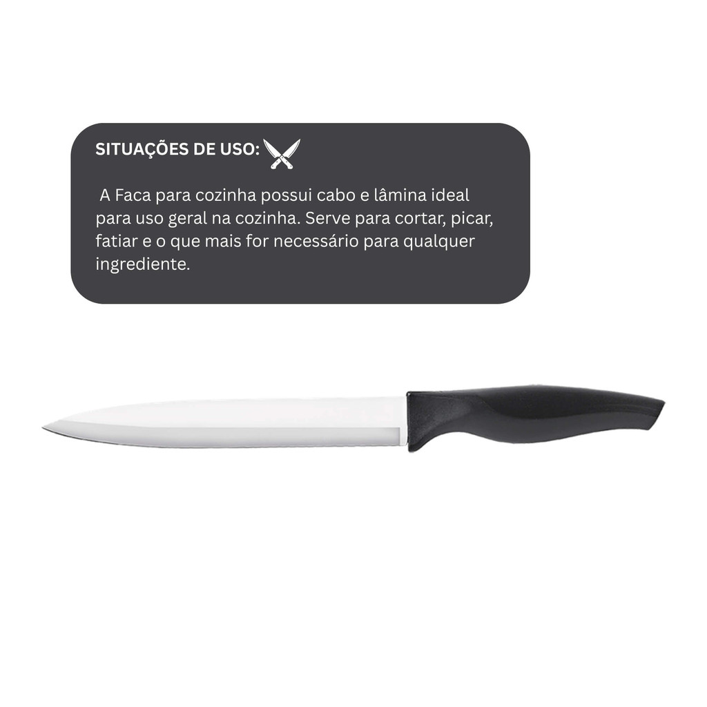 Praticidade e segurança para o seu dia a dia com a Faca para Cozinha 7 polegadas (30,5 cm) aço inoxidável polido, temperado com tratamento térmico e cabo preto Cross Brinox ideal para todos os tipos de corte. É o produto versátil que completa a sua linha de facas prontas para o uso no seu dia a dia. A Faca de Cozinha proporciona uma excelente afiação por um longo período de tempo. Assim como as demais facas da linha Cross, a Faca de Cozinha é durável e eficiente durante o uso. Os cabos ergonômicos em polipropileno, na cor preta possuem textura antiderrapante, são ideais para uso diário no preparo de diversos tipos de alimento, proporcionando maior praticidade durante o corte e limpeza da faca. É leve e segura para cortar, picar e fatiar todos tipos de alimentos. E para manter seus produtos sempre brilhando, lave-os com esponja macia e sabão ou detergente neutro. Para não riscar nem perder o brilho, não use produtos abrasivos como palha de aço. INFORMAÇÕES SOBRE O PRODUTO: - ATRIBUTOS TÉCNICOS: Todas as facas entregam durabilidade e eficiência durante o uso, a partir de suas lâminas em aço inoxidável temperadas. Os cabos ergonômicos em polipropileno, na cor preto com textura antiderrapante, são excelentes para uso diário no preparo de alimento, proporcionando maior praticidade durante o corte e limpeza da faca. - SITUAÇÕES DE USO: A Faca para cozinha possui cabo e lâmina ideal para uso geral na cozinha. Serve para cortar, picar, fatiar e o que mais for necessário para qualquer ingrediente. - LIMPEZA E CONSERVAÇÃO: Para manter seus produtos de aço inox sempre brilhando, lave-os com esponja macia e sabão ou detergente neutro. Produtos abrasivos como palha de aço e outros, poderão riscar ou prejudicar o brilho. Características: - Marca:Brinox - Modelo:2556/303 *Imagens Meramente Ilustrativas* Conteúdo da Embalagem: - 01 Faca para cozinha 7" Cross