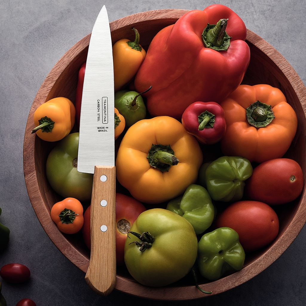 Faca de Cozinha Peixeira 8" Tramontina Cabo de Madeira 22950/008 Descrição do Produto: - As facas das linhas Carbono têm lugar certo em sua cozinha. O toque da natureza é dado por cabos rústicos de madeira, todos finalizados com rebites de alumínio. O poder de corte é garantido pelo tratamento térmico aplicado às lâminas de de aço carbono finalizadas com verniz protetor. Características: - Lâmina de aço carbono com maior durabilidade do fio devido ao tratamento térmico; - As facas com lâmina de aço carbono se caracterizam por uma maior resistência do fio, o que lhe confere bom poder de corte e, são facilmente afiadas; - Cabo de madeira natural com rebites de alumínio. Dados Técnicos: - Marca: Tramontina; - Referência: 22950/008; - Peso: 0,1kg; - Dimensões do produto: 326x40x15 mm. Recomendações de Uso: - As facas com lâmina de aço carbono se caracterizam por uma maior resistência do fio, o que lhe confere bom poder de corte e são facilmente afiadas; - Evite procedimentos que possam danificar o fio. Recomendam-se operações de corte sobre uma prancha de madeira ou plástico, que além de proteger as superfícies da sua cozinha, retardam o desgaste do fio da faca; - Lave-a após cada utilização com água morna e seque-a imediatamente, evitando assim que a faca seque naturalmente, pois a umidade é a maior inimiga de sua faca carbono; - Ao guardar sua faca carbono proteja a lâmina com algum óleo protetivo, o que reduzirá a possibilidade de oxidação. O azeite comestível é uma das alternativas. Componentes Inclusos na Embalagem: - 01 Faca de Cozinha Peixeira 8" Tramontina Cabo de Madeira 22950/008.