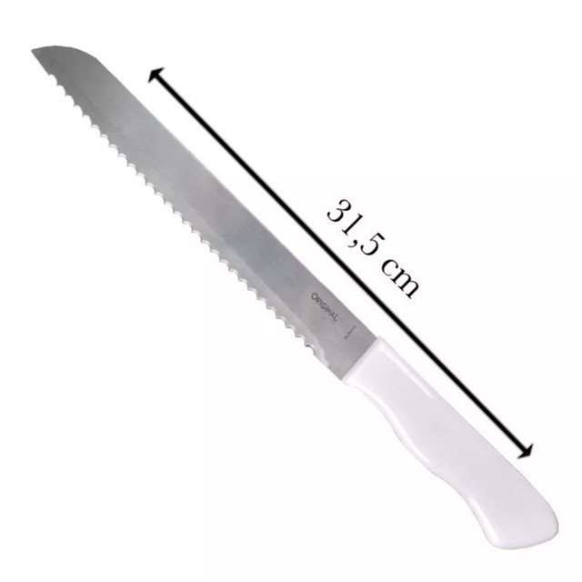 Faca de Pão Bolo Torta Lâmina Aço Inox 8 Polgadas 32,5cm Original Line Cabo Plástico Branco Cozinha Serra Serrilha