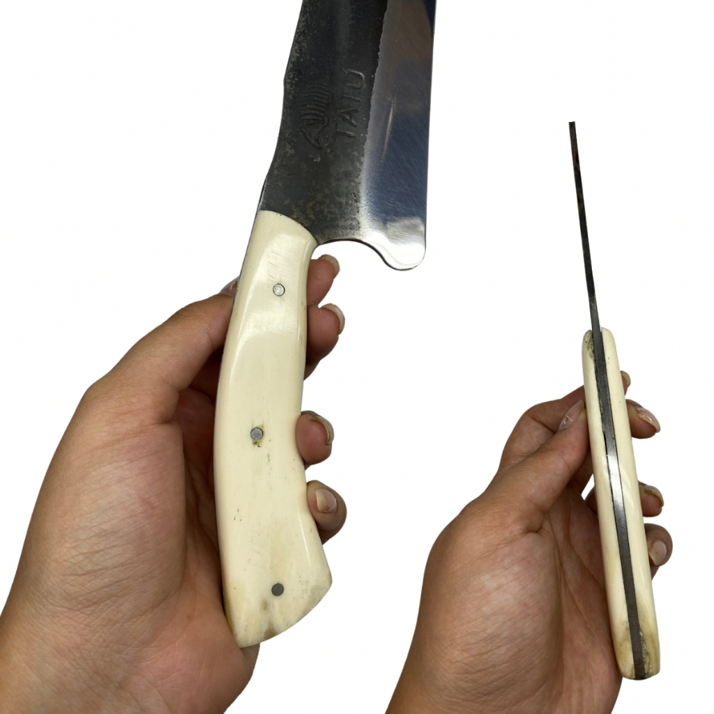 Modelo PICANHEIRA 8' Polegadas: 8'' 20cm de lâmina Cabo:12cm Aço: carbono 1070. Dorso:3MM dorso (mosqueado) Altura da lâmina: 5cm Detalhes da Lâmina: Sem Detalhes Cabo FULTANG: Em OSSO bovino natural. Faca temperada e revenida para melhor manutenção do fio; Faca de excelente fio e fácil manutenção; Acompanha bainha em couro legítimo.