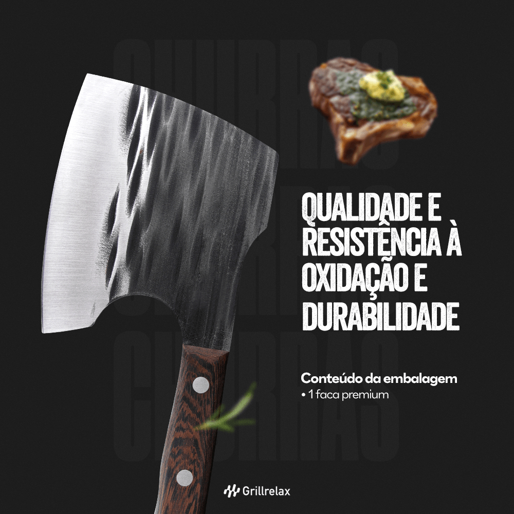 Faca Machado Premium - A Força e a Precisão que Você Merece A Faca Machado Premium combina a robustez de um machado com a precisão de uma faca, tornando-a indispensável para aventureiros, profissionais e entusiastas. CARACTERÍSTICAS QUE IMPRESSIONAM: Lâmina de Aço de Alta Resistência: Forjada para durar, a lâmina em aço de alta qualidade garante cortes potentes e precisos, resistindo aos trabalhos mais exigentes. Design Ergonômico e Equilibrado: O design da Faca Machado Premium foi pensado para proporcionar conforto e controle. Versatilidade Incomparável: Ideal para diversas tarefas. Acabamento Premium: Cada detalhe é cuidadosamente trabalhado, desde o polimento da lâmina até o encaixe perfeito do cabo, garantindo um produto de alta qualidade e beleza. CONTEÚDO DA EMBALAGEM: 1un Faca Machado Premium: Cortes com precisão e facilidade. ESPECIFICAÇÕES TÉCNICAS: - Material da Lâmina: Aço de alta resistência - Material do Cabo: Madeira compostos de alta performance - Design: Robusto e ergonômico - Acabamento: Premium Seja na natureza, no trabalho ou em situações de sobrevivência, a Faca Machado Premium é a ferramenta que você precisa para superar qualquer obstáculo. Adquira a sua agora mesmo e experimente a combinação perfeita de força, precisão e durabilidade. POR QUE ESCOLHER NOSSO PRODUTO? Qualidade superior: Utensílios e acessórios feitos com materiais duráveis e resistentes. Versatilidade: Ideal para churrascos em casa, no parque, na praia ou em qualquer lugar. Presente perfeito: Surpreenda seus amigos e familiares com um presente útil e sofisticado. Excelente custo-benefício: Invista em uma faca duradouro. ESSA FACA MACHADO É PERFEITO PARA: - Churrascos com amigos e familiares. - Presentear um churrasqueiro apaixonado. - Ter tudo o que precisa para um churrasco perfeito em um só lugar. MATERIAL DE QUALIDADE: - Utensílios em aço inox: maior resistência e durabilidade - Cabo de madeira longo: manuseio mais seguro contra altas temperaturas - Qualidade: resistência à oxidação e durabilidade Aproveite! GRILLRELAX EMPRESA DO MESMO GRUPO RELAXSHOP!
