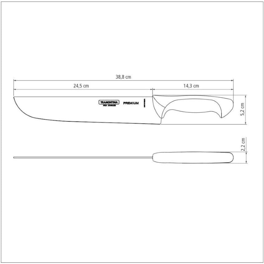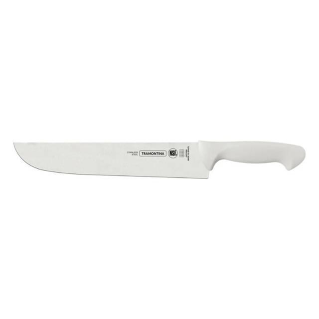 Faca para Carne Tramontina 10" Premium Chefe Aço Inox e Cabo de Polipropileno Branco A faca chef Tramontina Premium com lâmina em aço inox e cabo de polipropileno branco 10 polegadas é a protagonista da cozinha de quem ama preparar suas receitas! Sua lâmina de 10 polegadas é produzida em aço inox e possui fio de corte de alta durabilidade, devido ao tratamento térmico aplicado à lâmina. Seu cabo anatômico e texturizado é em polipropileno branco, e proporciona um manuseio muito mais seguro e confortável. Além de tudo, é fácil de limpar e pode ir à máquina de lavar louças. Uma faca de qualidade e com um design perfeito para quem gosta de fazer bonito todos os dias!