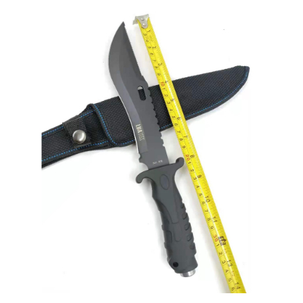 Faca com altíssima qualidade para uso em caça e pesca, no campo, churrascos, em casa feito para uso geral. Possui um ótimo acabamento, feito em aço inox, cabo emborrachado, pino quebra vidro em sua empunhadura, peso e empunhadura perfeito para seu manuseio, bainha de nylon com ótimo acabamento. Especificações: Cabo: Emborrachado Na Cor Preto Lâmina: Aço Inoxidável Na Cor Preto Peso da faca: 204g Peso da faca com bainha: 235g Comprimento da faca: 34 cm Comprimento da Lâmina: 21cm Comprimento do Cabo: 13cm Espessura: 2,56mm Peso da Faca: 204g Peso da Bainha: 31g Itens inclusos: Faca aço inoxidável preta com pino quebra vidro em sua empunhadura Bainha em nylon com passador de cinto Obs: Garantia somente para defeito de fábrica.