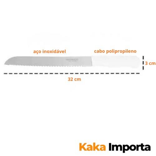 Seja bem-vindo(a) à nossa Loja Kaka Importa Desejamos ótimas compras e uma excelente experiência! PRODUTOS COM QUALIDADE EM DURABILIDADE COM PREÇOS DE ATACADO? VOCÊ SÓ ENCONTRA AQUI! ********ATENÇÃO A QUANTIDADE NA VARIAÇÃO****** 1 UNIDADE - 2 UNIDADES A faca de pão, caracterizada por sua lâmina longa e serrilhada, serve principalmente para cortar pães de casca dura (como baguetes e pães rústicos) e miolo macio sem amassá-los ou despedaçá-los. A serra desliza pela crosta firme, garantindo fatias limpas e precisas. PRINCIPAIS USOS DA FACA PARA PÃO: Pães artesanais e baguetes: Corta crostas duras sem amassar o interior. Bolos e tortas: A serra facilita o corte delicado de bolos, evitando que se desmanchem. Alimentos com casca firme/interior macio: Ideal para abacaxi, melão, melancia e tomates. Alimentos delicados ou duros: Excelente para cortar salame, queijos firmes e carnes assadas. POE QUE USAR A FACA SERRILHADA? Diferente de facas lisas que pressionam e amassam a massa, a faca de pão utiliza o movimento de "serrar" para romper a casca com o mínimo de esforço. Possui lâmina de 20 cm para maior alcance. Dúvidas? Entre em contato via chat. 📦 Envio rápido e seguro com Nota Fiscal Garantimos a qualidade do produto e a agilidade na entrega para que você receba seu pedido o quanto antes. 🀀Por que escolher Kaka Importa? Aqui você encontra produtos de alta qualidade, envio rápido e todo o cuidado para que sua experiência seja a melhor possível. 📦 Entrega imediata e qualidade garantida pela Kaka Importa!