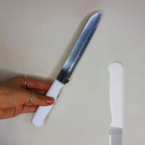 Faca Para Pão Bolos Tortas, Lâmina Serrilhada Aço Inox, Cabo Plástico Branco 32cm.