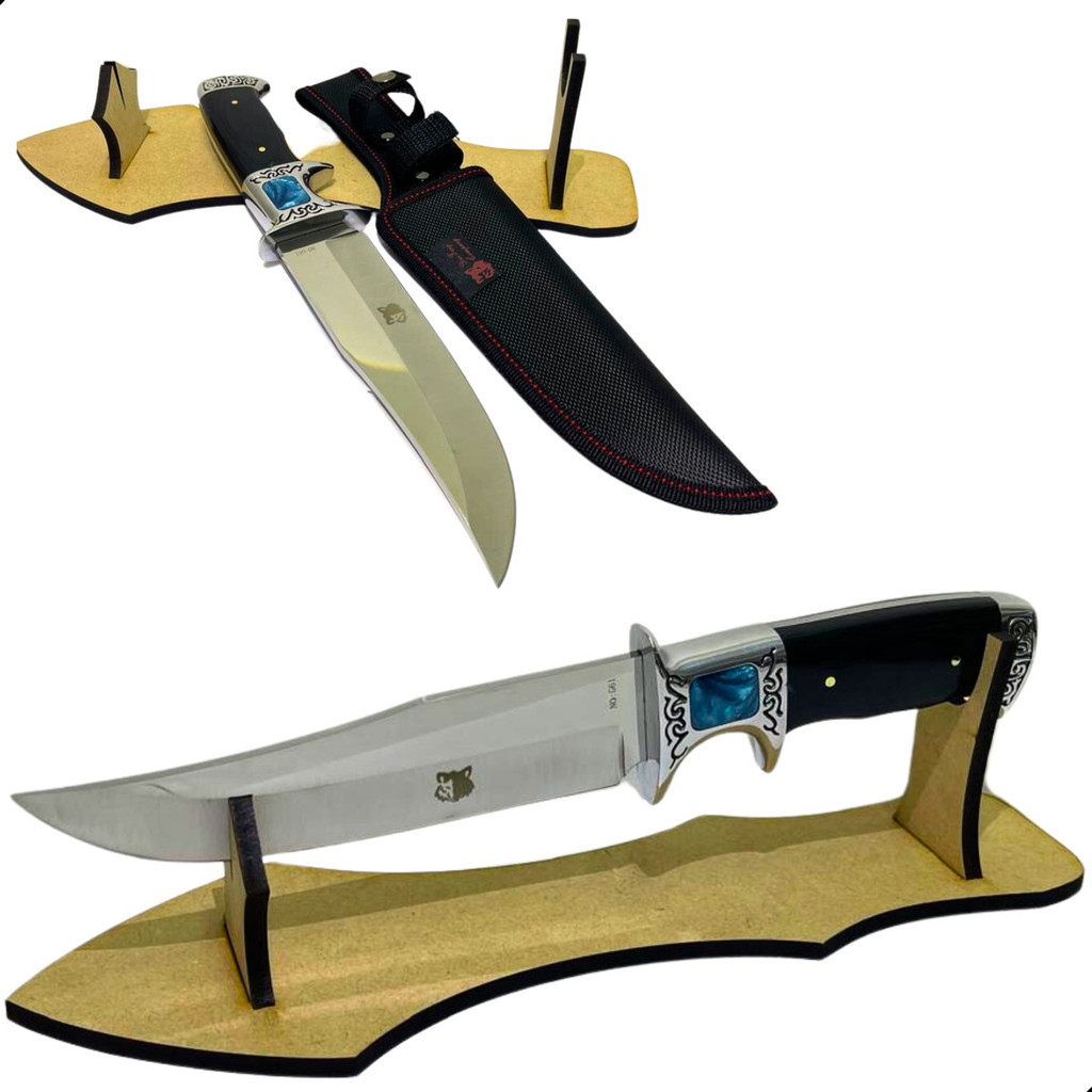 Faca de luxo e coleção Com Bainha + Suporte em MDF Indicado para pessoas exigentes. Tamanho total 29 cm Tamanho da lâmina 17 cm Tamanho do cabo 12 cm Produto de ótima qualidade Postagem Rápida!