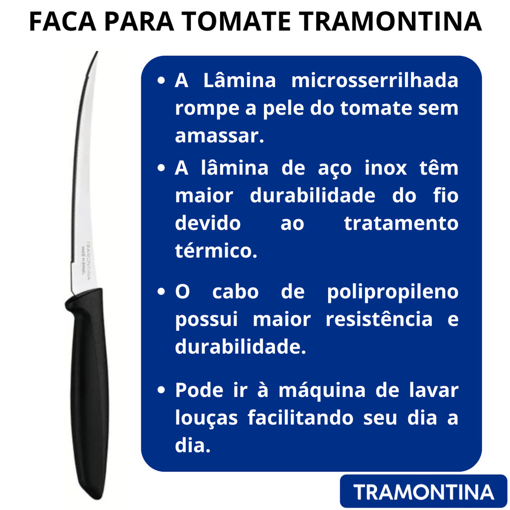 Faca para Tomate Tramontina Plenus – 5” | Aço Inox + Cabo em Polipropileno Preto Transforme sua rotina na cozinha com a qualidade e praticidade da Faca para Tomate Tramontina Plenus. Desenvolvida especialmente para cortar tomates, ela garante cortes precisos sem amassar o alimento, graças à sua lâmina microsserrilhada em aço inox. Com 5 polegadas, oferece resistência, durabilidade e excelente desempenho no uso diário. Seu cabo anatômico em polipropileno proporciona conforto e segurança durante o manuseio, tornando suas tarefas muito mais práticas. Por que escolher a Faca Tramontina Plenus? ✔ Lâmina em aço inox de alta qualidade ✔ Microsserrilha ideal para tomate e frutas de casca fina ✔ Cabo resistente, confortável e fácil de higienizar ✔ Design leve e funcional para o dia a dia ✔ Tradição e confiança da marca Tramontina Cuidados e Recomendações Lave e seque bem antes da primeira utilização. Produto cortante: manuseie com atenção e mantenha fora do alcance de crianças. Para maior durabilidade, seque completamente após a lavagem (mesmo em máquina). Utilize tábuas de polipropileno ou madeira para preservar o fio da lâmina. Não utilizar para cortar alimentos congelados. Descarte embalagens conforme orientações de reciclagem. Dimensões do Produto 📏 23,1 cm x 2,3 cm
