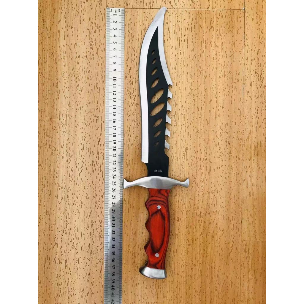 Especificações: Comprimento total: 38 cm Comprimento da lâmina: 22 cm Comprimento Cabo 12cm Guarda 3cm Material da lâmina: Aço Carbono 440, com proteção negra anti-ferrugem. Espessura da lâmina: 3 mm Cabo anatômico. Material da bainha: nylon reforçado preto. Peso aproximado: 450g
