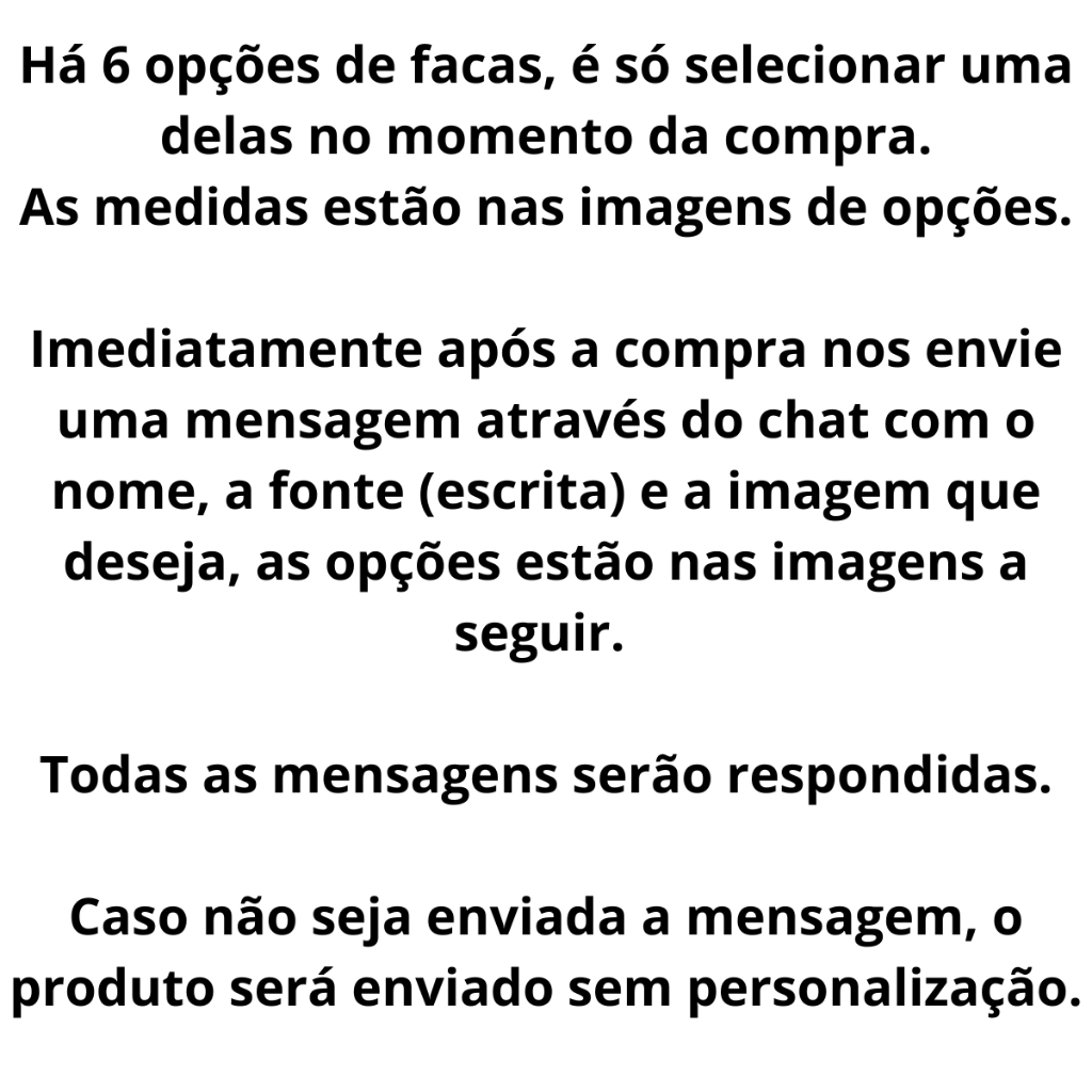 Olá futuro cliente, esperamos que esteja bem. Obrigado pela visita! Faca Artesanal Personalizada com Nome e Símbolo – Ideal para Churrasco, Camping, Caça e Presente Personalizado Transforme sua experiência ao ar livre ou na cozinha com esta faca artesanal de alta qualidade, ideal para quem busca estilo, resistência e exclusividade. Esta faca é perfeita para churrasco, caça, pesca, camping ou como peça decorativa e colecionável. Destaques do Produto: Personalização com nome e símbolo: Adicione seu nome, logotipo, brasão, profissão, time ou desenho preferido na lâmina — uma ótima opção para presente personalizado! Acompanha bainha resistente: Protege a lâmina e facilita o transporte seguro. Design robusto e elegante: Cabo com acabamento e entalhados, que conferem beleza e firmeza no manuseio. Lâmina afiada e resistente: Ideal para cortes precisos e pesados, seja na cozinha ou em ambientes externos. Indicações de uso: Churrasco e cozinha gourmet Sobrevivência, camping e bushcraft Pesca e caça Presente criativo e exclusivo Envios todos os dias, postagens em até 24 horas.