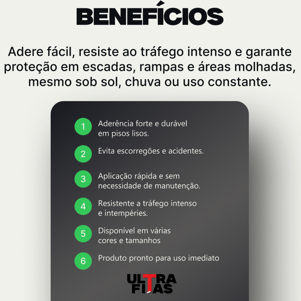 Fita Antiderrapante Ultra Fitas 48mm x 10m Auto‑adesiva, Ideal para Corredores Escadas e Rampas Interno/Externo Resistente à Água Garanta Segurança Total em Cada Passo com a Fita Antiderrapante ULTRA FITAS Lixa! Cansado de preocupações com pisos escorregadios, quedas e acidentes? A Fita Antiderrapante Lixa ULTRA FITAS 48mm x 5 metros na cor Transparente é a solução definitiva para proteger sua família, clientes e colaboradores. Desenvolvida para máxima aderência e durabilidade, ela oferece segurança extra onde você mais precisa, prevenindo acidentes em qualquer superfície. Por Que Escolher a Fita Antiderrapante ULTRA FITAS? Prevenção Garantida: Reduz drasticamente o risco de escorregões e quedas em áreas úmidas, escorregadias ou de alto tráfego. Adesivo Ultra Forte: Equipada com um adesivo acrílico de alta performance, garante fixação segura e permanente em diversas superfícies, sem descolar. Material de Alta Resistência: Composta por camada abrasiva de óxido de alumínio (grânulos de lixa) e base de PVC, assegura máxima aderência e longa vida útil, mesmo sob condições adversas. Resistente à Água e Intempéries: Ideal para ambientes internos e externos, suporta chuva, umidade e variações de temperatura sem perder a eficácia. Fácil e Rápida Aplicação: Dispensa ferramentas especiais! Basta limpar a superfície, remover o liner protetor e aplicar para uma fixação instantânea. Estética Discreta e Profissional: Na cor preta, integra-se facilmente a diferentes pisos e ambientes, mantendo a harmonia visual. Aplicações Perfeitas: Onde Sua Fita Antiderrapante se Destaca! Essencial para garantir a segurança em: Escadas e Degraus: Elimine o risco de quedas em cada degrau. Rampas e Acessos: Proporcione segurança em superfícies inclinadas. Áreas Molhadas: Banheiros, saídas de piscina, cozinhas industriais. Pisos Industriais e Comerciais: Garanta a segurança em locais de alto tráfego. Barcos e Áreas Marítimas: Resistência à água e ambientes úmidos. Saídas de Emergência e Corredores: Sinalize e proteja rotas importantes. Superfícies Diversas: Adere perfeitamente em madeira, metal, concreto, cerâmica e pisos de vinil. Modo de Aplicação Simples: Limpeza: Certifique-se de que a superfície esteja limpa, seca e livre de poeira, gordura ou umidade. Aplicação: Remova o liner de proteção da fita gradualmente, enquanto a aplica firmemente sobre a superfície desejada. Adesão: Pressione a fita do centro para as bordas para eliminar bolhas de ar e garantir contato total. Cura: Para melhores resultados, aguarde 24 horas antes de expor a fita a tráfego intenso ou umidade. Ficha Técnica / Características Principais Marca: Ultra Fitas Modelo: Lixa / Antiderrapante Tipo de fita: Antiderrapante Comprimento: 10 m Largura: 48 mm Cor: Preta Gramatura: 80 grit Material: PVC com grânulos de óxido de alumínio Tipo de adesivo: Acrílico de alta performance (extra forte) É à prova d'água: Sim É fluorescente: Não Formato de venda: Unidade Unidades por kit: 1 Superfícies recomendadas: Escadas, Degraus, Rampas, Pisos, Concreto, Madeira, Metal, Cerâmica, Vinil, Azulejo, Banheiros, Áreas de piscina, Cozinhas, Barcos, Saídas de emergência, Ambientes Industriais, Comerciais e Residenciais. Resistência: Água, Umidade, Tráfego Intenso, Variações de Temperatura. Outras características: Adesivo extra forte, Fácil aplicação, Alta resistência, Durabilidade. *PERGUNTAS FREQUENTES* 1. As fitas são a prova d’água? Não, as fitas são resistentes a água, como chuva ou lavagem do piso, porém não a prova d’água, o contato com água em abundância, em alta temperatura e ao longo prazo vai diminuir a durabilidade da fita, para uso em banheiro recomendamos o Líquido antiderrapante. 2. As fitas podem ser aplicadas em qualquer piso? Sim, porém não é recomendado aplicar a fita em pisos que já são antiderrapantes ou sobre rejuntes e irregularidades, deixar um espaço entre a fita e o piso pode fazer com que entre água e resíduos na parte adesiva da fita, por isso é importante cortar a fita na medida do local. 3. As fitas Ultra Fitas antiderrapantes podem ser aplicadas em áreas externas? Sim. Elas são projetadas e testadas para oferecerem alta resistência ao sol, chuva e variação de temperatura. 4. Elas são resistentes a produtos químicos? Em geral, tolera bem óleos, graxas, álcool e detergentes. Se em contato prolongado com produtos químicos muito fortes como ácidos e acetona, recomenda-se uma revisão após a limpeza do solo. 5. Qual é a duração deste tipo de fita? Para locais com tráfego de 1000 pessoas/dia, a duração é de aproximadamente 3 anos. Uma instalação correta e o uso de vedador de bordas pode prolongar a vida útil do produto. Em locais com menor circulação, a duração é maior. 6. Quanto tempo deve-se esperar para usar a área após a aplicação? Para conseguir o melhor rendimento da fita, deve-se esperar a cura completa, que se dará após 24 horas da aplicação.