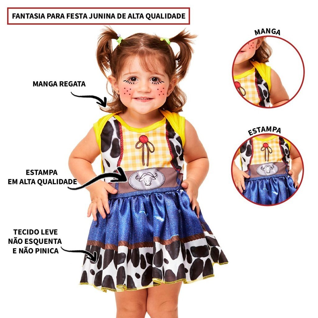 Itens inclusos 01 Vestido Tamanhos: M - Numeração de roupa 3 a 6 meses. G - Numeração de roupa 6 a 9 meses. GG - Numeração de roupa 9 a 12 meses. EG - Numeração de roupa 12 a 18 Meses. Ficou na dúvida de qual tamanho escolher? Sempre indicamos a escolha de um tamanho maior pois é mais fácil fazer um ajuste, caso necessário. E por ser para criança, a fantasia irá durar por mais tempo conforme ela for crescendo. Especificações Técnicas Material: Fantasia 100% poliéster exceto adornos. Produto: Fantasia nova, na embalagem. Produto Original Produto a pronta entrega! Este vestido Jessie é perfeito para qualquer menina que ama o personagem! É feito de materiais de alta qualidade e com certeza vai chamar a atenção por onde ela for. O vestido é composto por uma saia rodada com estampa de vaca e uma blusa amarela com detalhes em branco. A saia tem um babado na barra e a blusa tem mangas curtas e um decote redondo. Feito de materiais de alta qualidade Confortável e fresco Perfeito para brincar ou se fantasiar Um presente ideal para qualquer menina que ama Toy Story Disponível em vários tamanhos Compre agora e deixe sua filha se divertir muito com este vestido incrível!