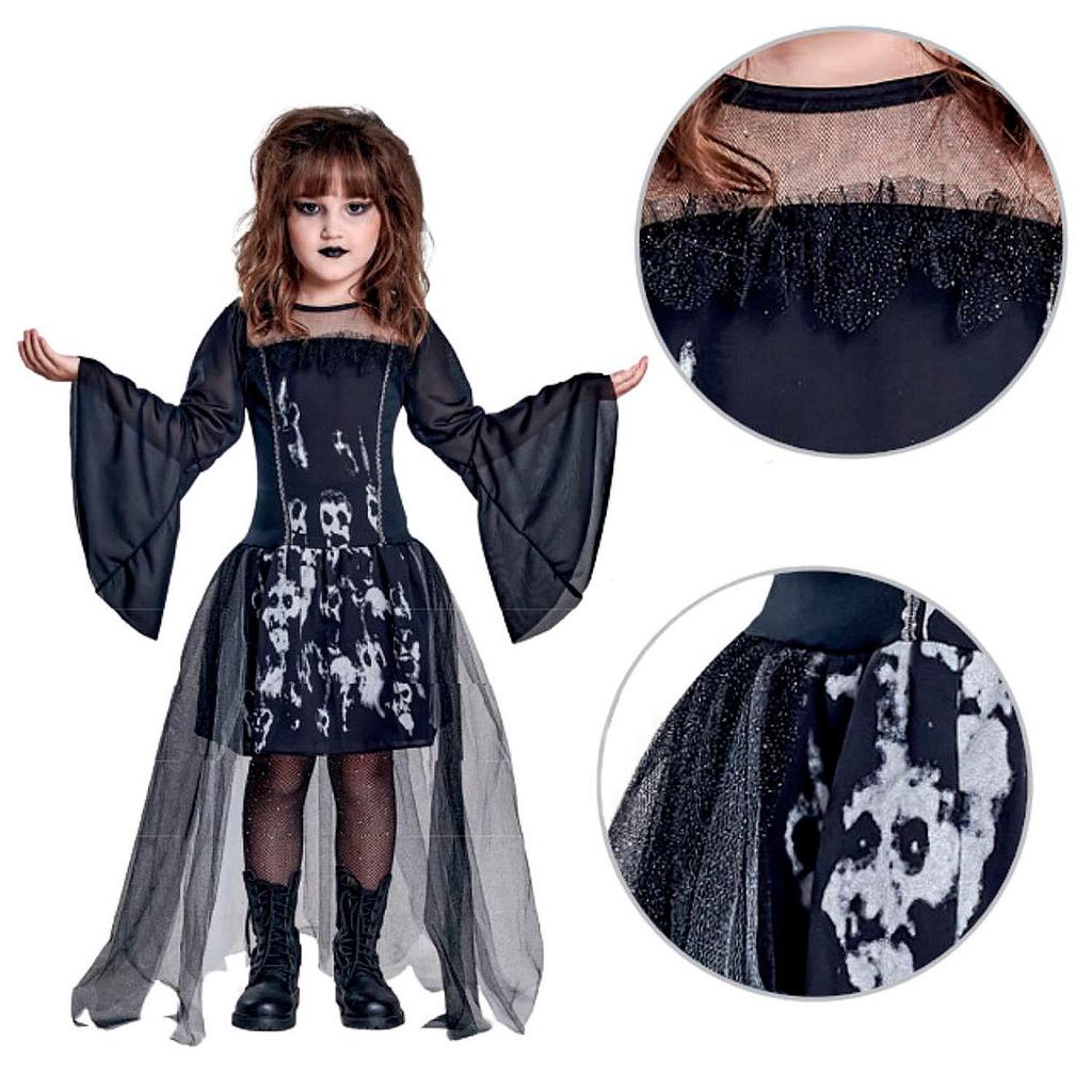 Fantasia Bruxa Halloween Infantil Vestido Longo e Moderno com Caveiras