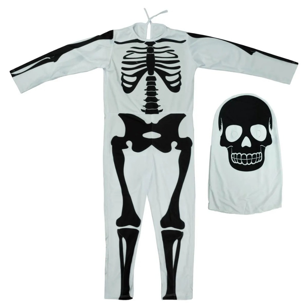 Fantasia Caveira Infantil de Halloween Longa Branca Com Gorro Esqueleto