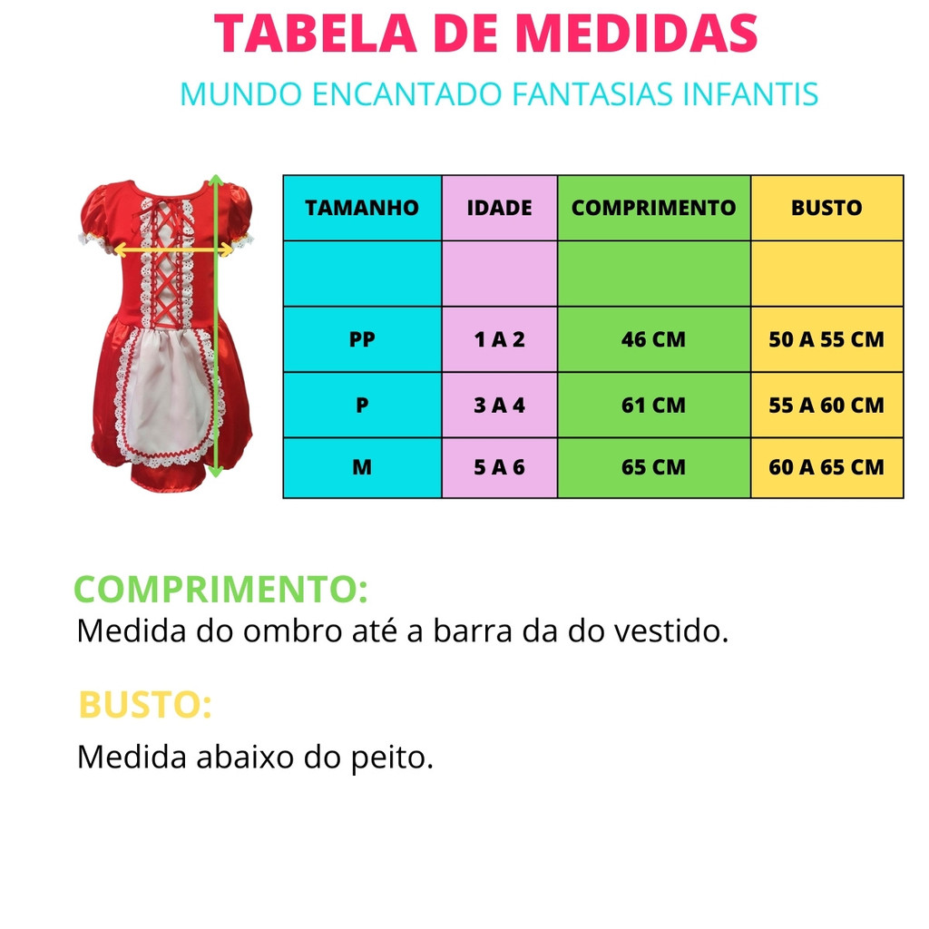 Fantasia Chapeuzinho Vermelho Infantil Encante a imaginação das crianças com a Fantasia Chapeuzinho Vermelho Infantil, perfeita para festas à fantasia, dia das crianças, apresentações escolares e momentos de diversão. O conjunto é composto por um vestido delicado com detalhes que remetem ao clássico conto de fadas e uma capa vermelha com capuz, que traz todo o charme e autenticidade da personagem. Confortável e cheia de estilo, é a escolha ideal para transformar a brincadeira em um verdadeiro mundo de magia e aventura. Destaques do Produto: Corpo do vestido confeccionado em malha helanca com renda e fitas aplicadas. Saia do vestido confeccionado em cetim com avental em Oxford e renda aplicado. Capa em cetim com acabamento em passamanaria. Perfeito para aniversários, festas à fantasia e apresentações escolares Acompanha: 01 Vestido 01 Capa Tamanho PP - Veste de 1 a 2 anos. Tamanho P - Veste de 3 a 4 anos. Tamanho M - Veste de 5 a 6 anos. Medidas: PP Comprimento - 46 cm Busto - 50 a 55 cm Capa - 55 cm Medidas: P Comprimento - 61 cm Busto - 55 a 60 cm Capa - 70 cm Medidas: M Comprimento - 65 cm Busto - 60 a 65 cm Obs. As medidas podem variar de 1 a 2 cm. Produto pronta entrega, para pedidos aprovados até as 11:00h enviamos no mesmo dia.