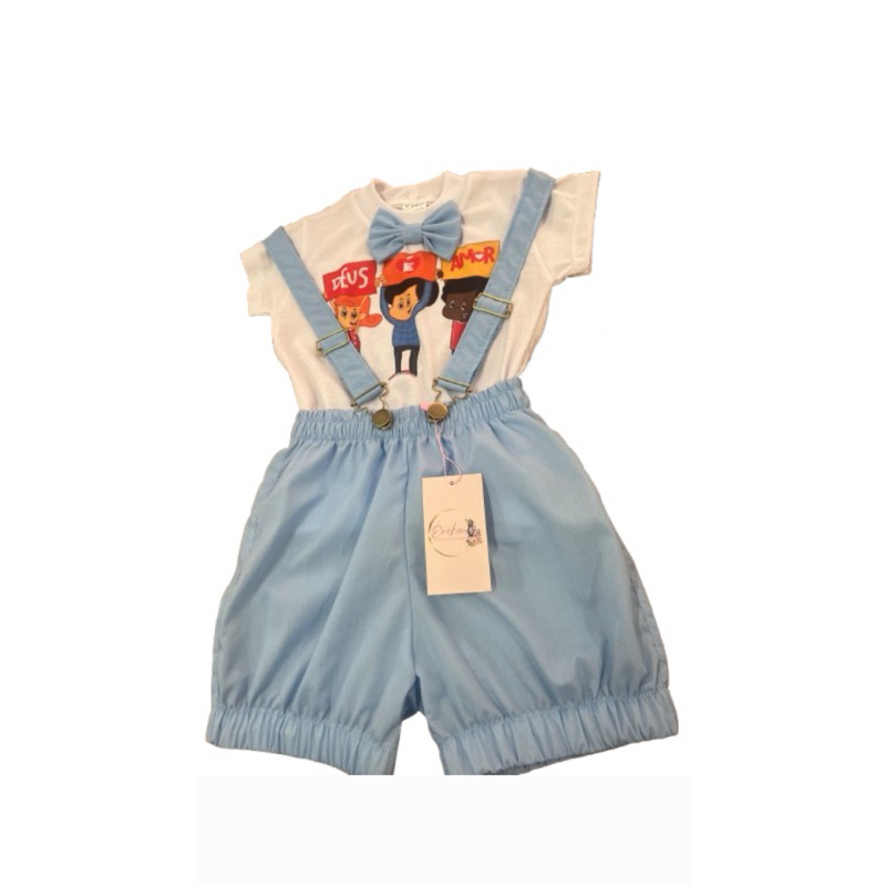 LEMBRANDO QUE PODERA HAVER VARIAÇÃO DE TONALIDADE DO PRODUTO DEPENDENDO DA TELA DO SEU DISPOSITIVO. SEJA BEM VINDO! Kit contem 1camiseta 1short com suspensório ajustável 1gravata borboleta fixa na golilha TAMANHO DISPONÍVEL TABELA Camiseta tecido poliéster TAM 1 largura 30 comprimento 36cm TAM 2 largura 33 comprimento 39cm TAM 4 largura 36 comprimento 44cm TAM 6 largura 39 comprimento 46cm Short tecido tricoline TAM 1 cintura 22 comprimento 26 cm TAM 2 cintura 24 comprimento 28cm TAM 4 cintura 26 comprimento 30cm TAM 6 cintura 30 comprimento 35cm Todos tamanhos podem ter alterações 2 cm/s tanto para mais ou menos