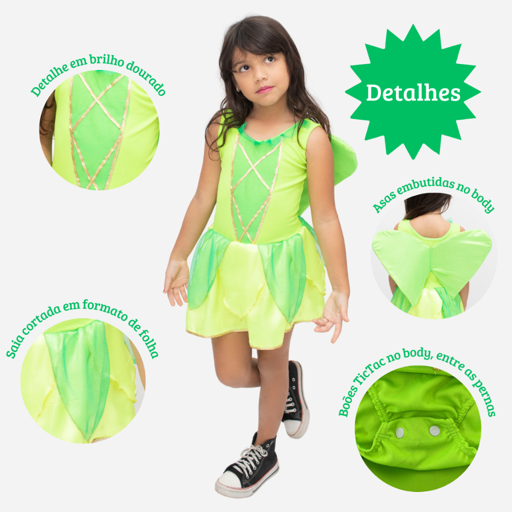 Deixe sua pequena brilhar com a magia da Fada Sininho, a famosa Fada Artesã! Essa brilhosa fantasia é composta por um lindo vestido verde claro que possui brilho dourado no peito, e sua saia cortada em formato de folha é trabalhada no cetim verde. Look para uma verdadeira fada, o vestido vai acompanhado com lindas asas verdes glitterizadas que são costuradas no body do vestido. Contém: Vestido com a asa embutida. TABELA DE MEDIDAS: Tamanho 1 ano : Comprimento do vestido: 43cm / Busto: 50cm / Comprimento do body: 38cm Tamanho 2 anos : Comprimento do vestido: 50cm / Busto: 52cm / Comprimento do body: 43cm Tamanho 4 anos : Comprimento do vestido: 53cm / Busto: 66cm / Comprimento do body: 47cm Tamanho 6 anos : Comprimento do vestido: 60cm / Busto: 68cm / Comprimento do body: 51cm Tamanho 8 anos : Comprimento do vestido: 61cm / Busto 70cm / Comprimento do body: 55cm Tamanho 10 anos: Comprimento do vestido: 64cm / Busto: 72cm / Comprimento do body: 60cm Tamanho 12 anos: Comprimento do vestido: 68cm / Busto: 74cm / Comprimento do body: 62cm