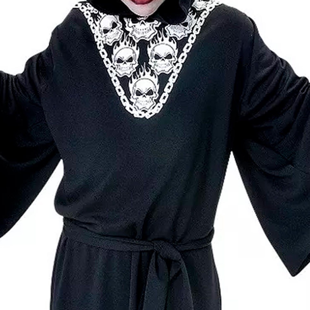 Itens inclusos na fantasia do 1 capa preta com capuz de morte Tamanhos: P - Numeração de roupa 2 a 4, para crianças que tenham até 99 cm de altura, dos pés a cabeça. M - Numeração de roupa 5 a 8, para crianças que tenham de 100 a 119 cm de altura, dos pés a cabeça. G - Numeração de roupa 9 a 12, para crianças que tenham de 120 a 140 cm de altura, dos pés a cabeça. GG - Numeração de roupa 13 a 16, para crianças que tenham de 140 a 160 cm de altura, dos pés a cabeça. Ficou na dúvida de qual tamanho escolher? Sempre indicamos a escolha de um tamanho maior pois é mais fácil fazer um ajuste, caso necessário. E por ser para criança, a fantasia irá durar por mais tempo conforme ela for crescendo. Especificações Técnicas Produto: Fantasia nova, na embalagem. Produto a pronta entrega! A fantasia Cavaleiro Das Sombras é uma fantasia de Halloween! Sua estampa de correntes e caveiras flamejantes em alta qualidade na região da gola e busto é exclusivo e aterrorizante. A túnica preta é longa e possui um capuz embutido, essa vestimenta envolve o corpo do jovem cavaleiro com um tecido macio e sinuoso, mangas longas de boca de sino e acompanha um cinto de tecido para ajuste perfeito. Tunica Preta Com Capuz Estampa Aterrorizante Mangas Boca de Sino Com Faixa pra Amarrar Não pinica Não esquenta Secagem rápida Leve e confortável
