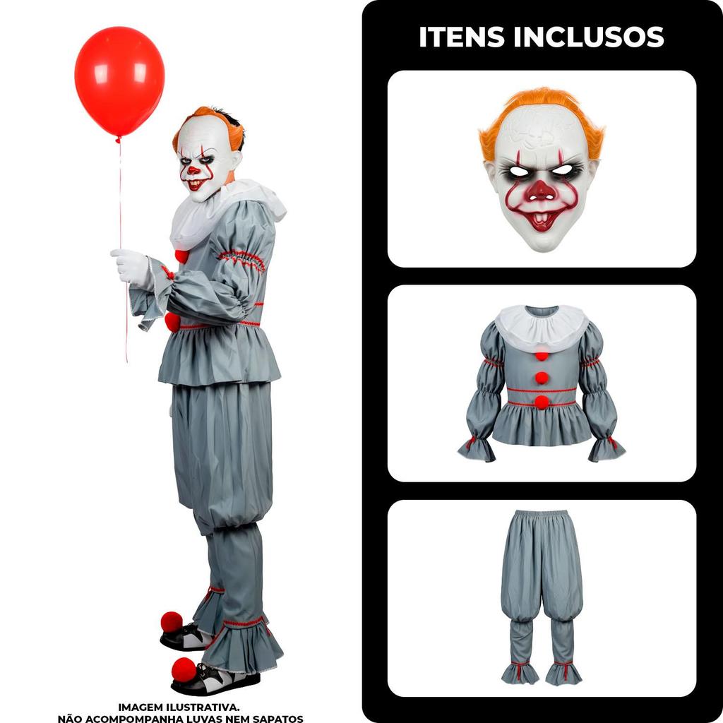 Kit It a Coisa Roupa e Máscara Fantasia de Halloween Cosplay Masculino Adulto Prepare-se para encarnar o Palhaço Assassino mais temido do cinema com este Kit Fantasia Pennywise IT a Coisa Adulto! Este conjunto é a escolha perfeita para quem busca um visual de terror autêntico e de impacto neste Halloween. O kit inclui a roupa principal, composta por camisa manga longa, calça e uma gola com babados, recriando o icônico traje do personagem Pennywise. A fantasia é confeccionada em material de alta qualidade e bem detalhada, garantindo um ótimo caimento. Para completar, o kit acompanha uma máscara que replica o rosto assustador do Palhaço IT, com aberturas estratégicas para os olhos, permitindo que você mantenha a atmosfera horripilante a noite inteira. Vista esta fantasia para festas de Halloween, eventos de Cosplay ou para assustar a vizinhança! É o conjunto completo para um terror de cinema. Blusa e calça com manchas de sangue realistas Fantasia Pennywise Luxo Máscara com detalhes realistas Confortável de alta qualidade Mascara com elástico OBS: Não acompanha sapatos, balão e lUVAS. Descubra nossas fantasias masculinas de luxo, perfeitas para quem busca exclusividade e sofisticação no Halloween. Transforme-se em It a Coisa com trajes únicos, feitos com materiais premium e acabamentos impecáveis. Brilhe com estilo e elegância! Confira agora. Itens inclusos: 01 Camisa Manga Longa (com gola) 01 Calça 01 Máscara Dimensões do produto: Tamanho PP - Numeração de roupa tamanho 32 - 34 P - Numeração de roupa tamanho 36 - 38 M - Numeração de roupa tamanho 40 - 42 G - Numeração de roupa tamanho 44 - 46 GG - Numeração de roupa tamanho 46 - 48 Ficou na dúvida de qual tamanho escolher ? Sempre indicamos a escolha de um tamanho maior pois é mais fácil fazer um ajuste, caso necessário. Especificações Técnicas Material: Poliéster e Polietileno Cor: Branco, Cinza e Vermelho Produto: Novo, na embalagem. Produto a pronta entrega! Produto original!