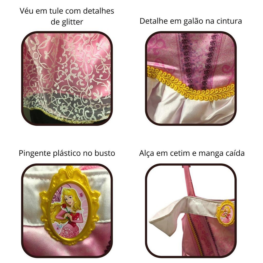 Fantasia Bela Adormecida Aurora Clássica Vestido Princesas Disney Infantil Feminina Encante sua pequena com a Fantasia Infantil Princesa Aurora Luxo Clássica Original Disney. Este deslumbrante vestido apresenta um pingente no busto, véu em tule com glitter na saia, galão na cintura e alças em cetim com mangas caídas. Cada detalhe é projetado para proporcionar autenticidade, elegância e conforto, transformando sua criança na própria Aurora. Uma peça encantadora que promete criar memórias mágicas e tornar os contos de fadas realidade. Original Disney Fresco e Leve Não Desbota Não Encolhe Não pinica Não esquenta Secagem rápida Leve e confortável A fantasia infantil que sua filha tanto sonhava para ir nas festas, com acabamento impecável e qualidade comprovada. A festa da sua pequena será com muita diversão e alegria, tudo perfeito para se tornar um dia inesquecível com a fantasia para meninas que amam Princesa Aurora. Aproveite e confira todas nossas fantasias para meninas com os melhores preços do mercado! Itens inclusos 01 Vestido Aurora Tamanhos: P - Indicado para crianças que usam roupas de Numeração 2 a 4 anos, e que tenham até 99 cm de altura, dos pés a cabeça. M - Indicado para crianças que usam roupas de Numeração 5 a 8, e que tenham de 100 a 119 cm de altura, dos pés a cabeça. G - Indicado para crianças que usam roupas de Numeração 9 a 12, e que tenham de 120 a 140 cm de altura, dos pés a cabeça. Ficou na dúvida de qual tamanho escolher? Sempre indicamos a escolha de um tamanho maior pois é mais fácil fazer um ajuste, caso necessário. E por ser para criança, a fantasia irá durar por mais tempo conforme ela for crescendo. Especificações Técnicas Material: Fantasia 100% poliéster exceto adornos. Produto: Fantasia nova, na embalagem. Cor: Rosa Produto a pronta entrega! Produto Original