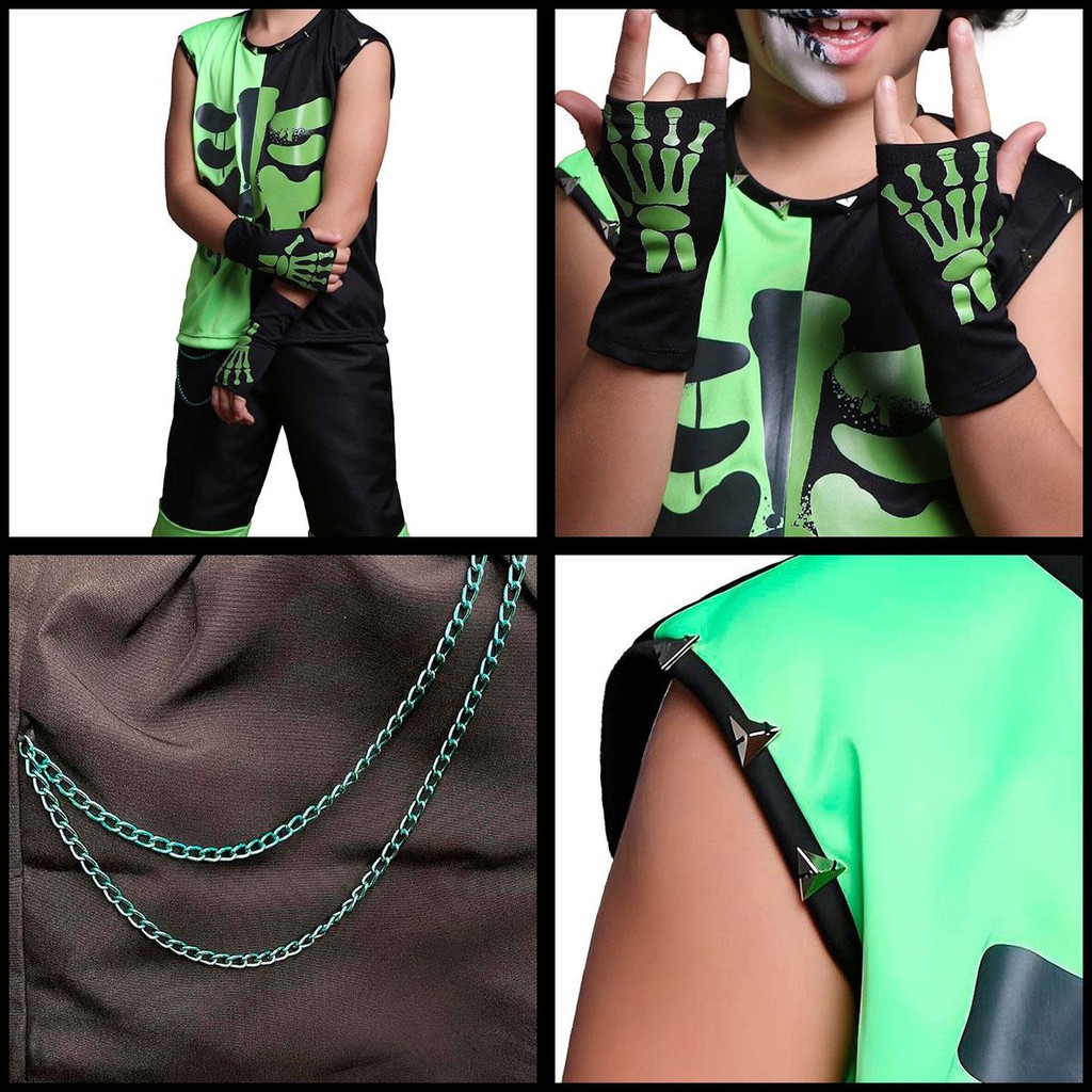 Fantasia Infantil Halloween pra Menino Estiloso Roupa Caveira Verde e Preta Curta de Luxo Com Luvas Meio Dedo
