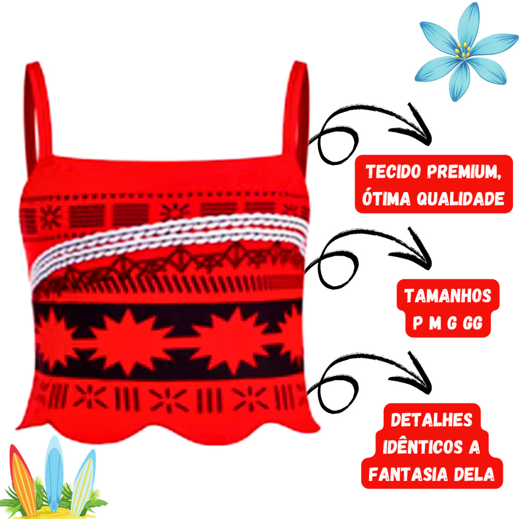 Fantasia Moana Infantil Com Colar e Faixa Filme Moana Festas Princesas Sua filha vai amar se transformar na Moana! A Fantasia Moana Infantil é perfeita para festas e brincadeiras. Com detalhes incríveis e materiais confortáveis, ela garante a diversão da sua pequena Ficha Técnica Material: Poliéster (principalmente) Itens Inclusos no pacote: 1 Top 1 Saia Cores disponiveis: Cores características da personagem Moana: tons terrosos, vermelho, laranja e MEDIDAS TAMANHO PP - SERVE 1 ANO Cintura 58cm Busto 40cm TAMANHO P - SERVE DE 3a 4ANOS Cintura 62cm Busto 44cm TAMANHO M - SERVE DE 5 a 7 ANOS Cintura 72cm Busto 58cm TAMANHO G - SERVE DE 8 a 10 ANOS Cintura 76cm Busto 62cm TAMANHO GG - SERVE DE 10 A 111 ANOS Cintura 80cm Busto 65cm Nós da cyberimports oferecemos: Fotos Reais do Produto; Agilidade na postagem (após confirmação pagamento); Produtos Novos e a Pronta Entrega; Produtos de Qualidade; Atendimento Personalizado. NÃO ACOMPANHA COLAR ️Observações Importantes️ - Garantia de 03 meses contra defeito de fabricação. Produto à pronta entrega para envio imediato! Receba no conforto de sua casa! Prezamos pela segurança e agilidade no envio. Qualquer dúvida, escreva no campo de perguntas abaixo, estamos à disposição! Aguardamos ansiosamente seu pedido! —------------------------------------------------------------------- DÚVIDAS FREQUENTES MINHA COMPRA É SEGURA? -Toda transação na Shopee é feita em ambiente seguro, isso significa que se caso ocorra algum imprevisto, a Shopee fará o estorno do seu pagamento PRODUTO COM NOTA FISCAL? -Produto bem embalado e com nota fiscal POSSO DEVOLVER SE EU NÃO GOSTAR? -Você tem 7 dias após o recebimento para troca ou devolução QUANDO É FEITO O ENVIO? -Envio mais rápido da Shopee, em menos de 24h após confirmação da compra ----------------------------------------------------------------------------------------------------------------------------------------------------- Título: Fantasia Moana Infantil com Colar e Faixa - Festas e Princesas Palavras-chave: fantasia moana, fantasia moana infantil, fantasia moana bebe, fantasia moana luxo, roupa moana, vestido moana, fantasia princesa, fantasia disney, festa moana, tema moana, colar moana, faixa moana, fantasia infantil feminina, fantasia para festa infantil