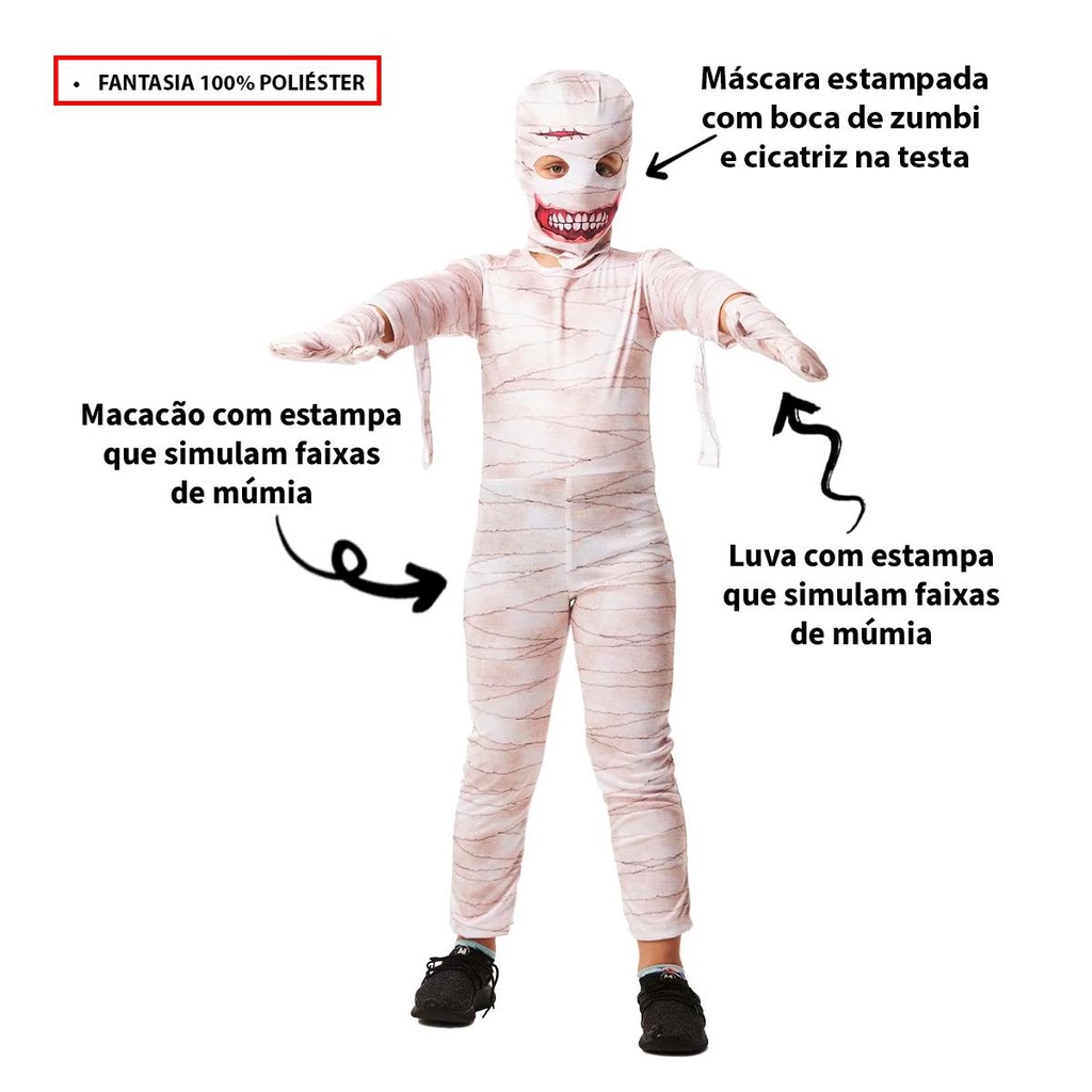 Itens inclusos na fantasia 1 fantasia Mumia Infantil de Halloween 1 máscara de Halloween 1 par de luvas de Halloween Tamanhos: P - Numeração de roupa 2 a 4. M - Numeração de roupa 5 a 8. G - Numeração de roupa 9 a 10. GG - Numeração de roupa 11 a 12.. Ficou na dúvida de qual tamanho escolher ? Sempre indicamos a escolha de um tamanho maior pois é mais fácil fazer um ajuste, caso necessário. E por ser para criança, a fantasia irá durar por mais tempo conforme ela for crescendo. Especificações Técnicas Material: Fantasia 100% poliéster. Produto: Fantasia nova e na embalagem. Fantasia a pronta entrega! Prepare-se para uma noite de sustos e diversão com esta incrível fantasia de múmia! Nosso macacão é projetado com estampas que simulam as faixas de uma múmia antiga. Acompanha uma máscara estampada com uma boca de zumbi e uma cicatriz na testa, criando uma aparência verdadeiramente aterrorizante. As luvas também possuem estampas que imitam as faixas de múmia, completando o visual. Com Luvas Com Máscara Assustadora Modelo Longo Não pinica Não esquenta Secagem rápida Leve e confortável