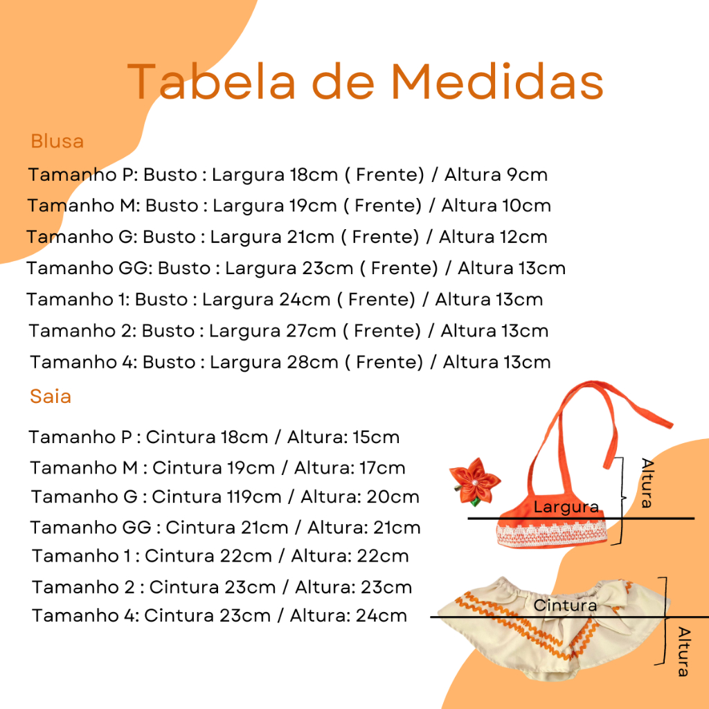 Como sabemos a Moana é uma princesa aventureira, e claro, para ser uma aventureira de verdade sempre precisa estar com uma roupa confortável, certo? Tendo isso em mente, troxemos um lindo conjunto confortável para a pequenas de vocês. Com excelente acabamento, o peito possui detalhe de renda na frente, a calcinha/saia é confeccionada com sianinha em formato de ondas com um lindo laço na frente na mesma cor do tecido da saia, preso em alfinete. Contém: Blusa + Short/Saia PRONTA ENTREGA - ENVIAMOS PARA TODO O BRASIL. FOTOS REAIS DO PRODUTO. OBS: A fantasia baby é padrão para a idade, porém peço a vocês que antes de realizar a compra, olhem as medidas de cada tamanho abaixo, pois existem crianças que vestem tamanhos diferentes da idade, assim você tem uma compra tranquila e certa, evitando imprevistos. == TABELA DE MEDIDAS: BLUSA P: BUSTO : LARGURA 18CM ( FRENTE) / ALTURA 9CM M: BUSTO: LARGURA 19CM ( FRENTE) / ALTURA 10CM G: BUSTO : LARGURA 21CM ( FRENTE) /ALTURA :12CM GG: BUSTO : LARGURA 23CM ( FRENTE) /ALTURA :13CM 1 ano: BUSTO: LARGURA 24CM ( FRENTE) / ALTURA 13CM 2 anos: BUSTO: LARGURA 27CM ( FRENTE) / ALTURA 13CM 4 anos: BUSTO: LARGURA 28CM ( FRENTE) / ALTURA 13CM CALCINHA P: CINTURA 18CM / ALTURA 15CM M: CINTURA 19CM / ALTURA 17CM G: CINTURA 19CM / ALTURA :20CM GG: CINTURA 21CM / ALTURA :21CM 1 ano: CINTURA 22CM / ALTURA 22CM 2 anos: CINTURA 23CM / ALTURA 23CM 4 anos: CINTURA 23CM / ALTURA 24CM ===PERGUNTAS FREQUENTES=== >PERG: Boa noite, vem com a presilha junto com a fantasia? RESP: Boa noite a precilha vai junto sim, caso queira que vá na faixa meia , favor comunicar no pedido. >PERG: Quais os tamanhos disponíveis? RESP: Bom dia, trabalhamos com p até 4 anos. > PERG: Possui tamanho 3 anos ? RESP: Não nossa grade é par tirando o 1 ano, 2,4 , ou seja o 4 anos veste 3 e 4 anos. >Como verifico o prazo? RESP: Pode fazer uma simulação de compra que quando colocar o cep irá aparecer o prazo de entrega, pois nosso produto é enviado pela transportadora da shoppe e não conseguimos verificar o prazo. >Qualquer dúvida pode usar o campo de perguntas, temos uma equipe treinada para melhor atender nossas clientes. ===PERGUNTAS FREQUENTES=== >PERG: Boa noite, vem com a presilha junto com a fantasia? RESP: Boa noite não vai com a presilha. >PERG: Quais os tamanhos disponíveis? RESP: Bom dia, trabalhamos com p até 4 anos. > PERG: Possui tamanho 3 anos ? RESP: Não nossa grade é par tirando o 1 ano, 2,4 , ou seja o 4 anos veste 3 e 4 anos.
