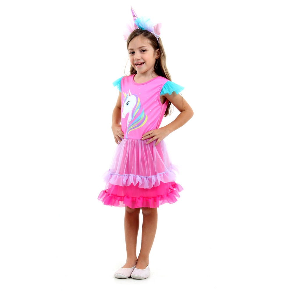 Fantasia Unicórnio Rosa E Azul Vestido Infantil Com Tiara