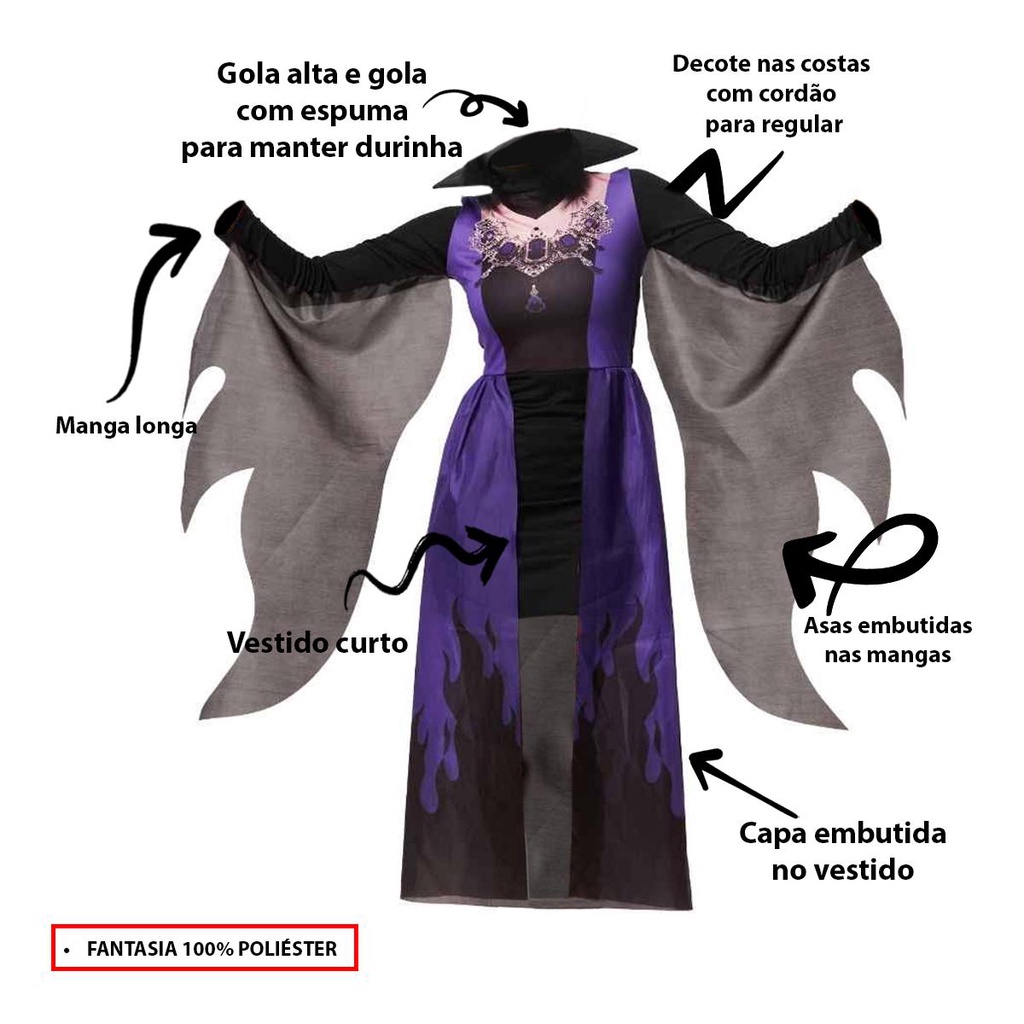Vestido de Bruxa ou Vampira Fantasia Halloween pra Mulher Adulta Feminina Prepare-se para uma noite mágica e misteriosa com este incrível vestido de Halloween que vai deixar todos de queixo caído! Este vestido luxuoso nas cores preto e roxo apresenta uma capa embutida na saia trazendo sensualidade sem mostrar muito o corpo, apenas as curvas, as asas de morcego costuradas na manga remete modernidade ao look de halloween 2023, já a gola é estruturada, o colo possui um tecido na cor bege imitando uma pele e uma estampa de um lindo colar e vestido tomara que caia. Feito para quem quer arrasar na roupa de dia das bruxas! Tema Halloween Não pinica Não esquenta Secagem rápida Leve e confortável Tem uma festa a fantasia para ir? Agora só falta escolher a fantasia feminina preferida para arrasar na festa! Temos vários modelos de fantasia para adulto confeccionada em material leve, de alta qualidade e superconfortável para garantir a diversão ao máximo. Aproveite nossa linha de fantasia de TEMA com os melhores preços no mercado. Itens inclusos na fantasia 1 vestido de halloween Tamanho: P - Numeração de roupa 36 a 38. M - Numeração de roupa 40 a 42. G - Numeração de roupa 44 a 46. GG - Numeração de roupa 48 a 50. Ficou na dúvida de qual tamanho escolher? Sempre indicamos a escolha de um tamanho maior pois é mais fácil fazer um ajuste, caso necessário. Especificações Técnicas Material: Fantasia 100% poliéster. Produto: Fantasia nova e na embalagem. Fantasia a pronta entrega!