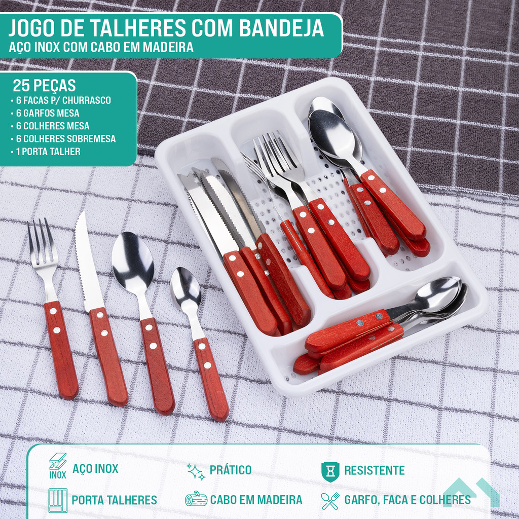 JOGO DE TALHERES CABO EM MADEIRA COM PORTA TALHERES 25 PEÇAS – MM House Dê um toque de elegância e praticidade à sua cozinha com o Jogo de Talheres Inox e cabo de madeira da MM House. Ideal para uso diário ou ocasiões especiais, este conjunto combina qualidade, durabilidade e organização em um único produto. Fabricado em aço inoxidável, oferece alta resistência à corrosão e maior durabilidade, garantindo um excelente custo-benefício para sua casa. Seu cabo de madeira, é resistente, não estraga com a água e dá um charme para os talheres. Além disso, acompanha um organizador de gavetas com divisórias, mantendo seus talheres organizados e de fácil acesso. Características e Usabilidade: • Versátil e Completo: Inclui facas, garfos, colheres de mesa e sobremesa, perfeitos para refeições cotidianas ou eventos especiais. • Material de Alta Qualidade: Aço inoxidável e madeira nos talheres e polipropileno no porta-talheres, garantindo resistência e facilidade na limpeza. • Design Moderno e Funcional: Organização prática com o porta-talher na mesma cor do conjunto, ideal para manter sua cozinha sempre arrumada. Medidas dos Talheres: • Faca: 21,5 cm • Garfo: 19 cm • Colher de Mesa: 19 cm • Colher de Sobremesa: 15 cm Medidas do Porta Talher: • Largura: 20,5 cm • Comprimento: 29 cm • Altura: 4 cm Porta Talher: Plástico ABS Talheres: Cabo Madeira / Ponta Aço Inox Itens Inclusos na Embalagem (25 peças): • 6 Facas para Churrasco • 6 Garfos de Mesa • 6 Colheres de Mesa • 6 Colheres de Sobremesa • 1 Porta Talher com Divisórias Dicas de Uso e Conservação: • Mantenha as facas fora do alcance de crianças. • Não leve o produto diretamente ao fogo. • Lave com água e sabão neutro para preservar o brilho e a durabilidade.