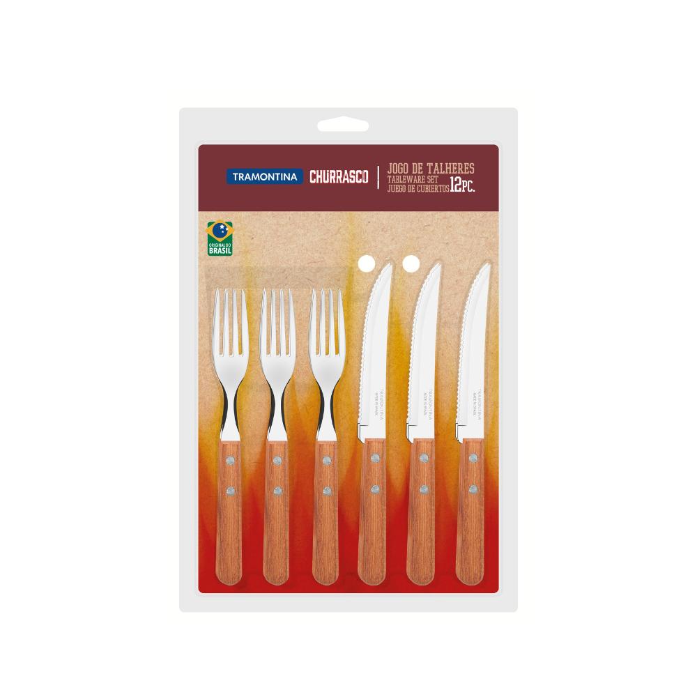 Faqueiro Tramontina Cabo De Madeira Inox 24 Peças Dynamic O Jogo de Talheres Tramontina Churrasco com Lâminas em Aço Inox e Cabos de Madeira Natural 24 Peças é a escolha perfeita para garantir durabilidade e conforto para os encontros. São 24 peças produzidas com cabo de madeira natural e rebites de alumínio, as lâminas das peças são em aço inox e possuem características que as tornam a melhor escolha para servir à mesa. As facas têm maior durabilidade do fio devido ao tratamento térmico e os garfos contam com lâminas com maior espessura e uma estampagem do aço que garante maior resistência. São itens que garantem bom gosto e sofisticação para servir os amigos. Descrição do produto Composição: 02 unFaqueiro Tramontina Cabo De Madeira Inox 12 Peças Dynamic (total 24pçs) Marca: Tramontina Tipo: Churrasco Cor: Madeira natural Quantidade de Peças: 24 Peças Material Cabo: Madeira Linha Comercial - Jogos de Talheres Dynamic 12x Faca para Churrasco/ Frutas 5" Dynamic 12x Garfo de Mesa Dynamic Dimensões do Produto (AxLxP): Faca de Churrasco 1 cm x 21,2 cm x 1,9 cm Garfo de Mesa 1,7 cm x 19,5 cm x 2,4 cm Imagens meramente ilustrativas, todos os itens que ambientam o produto não estão inclusos.