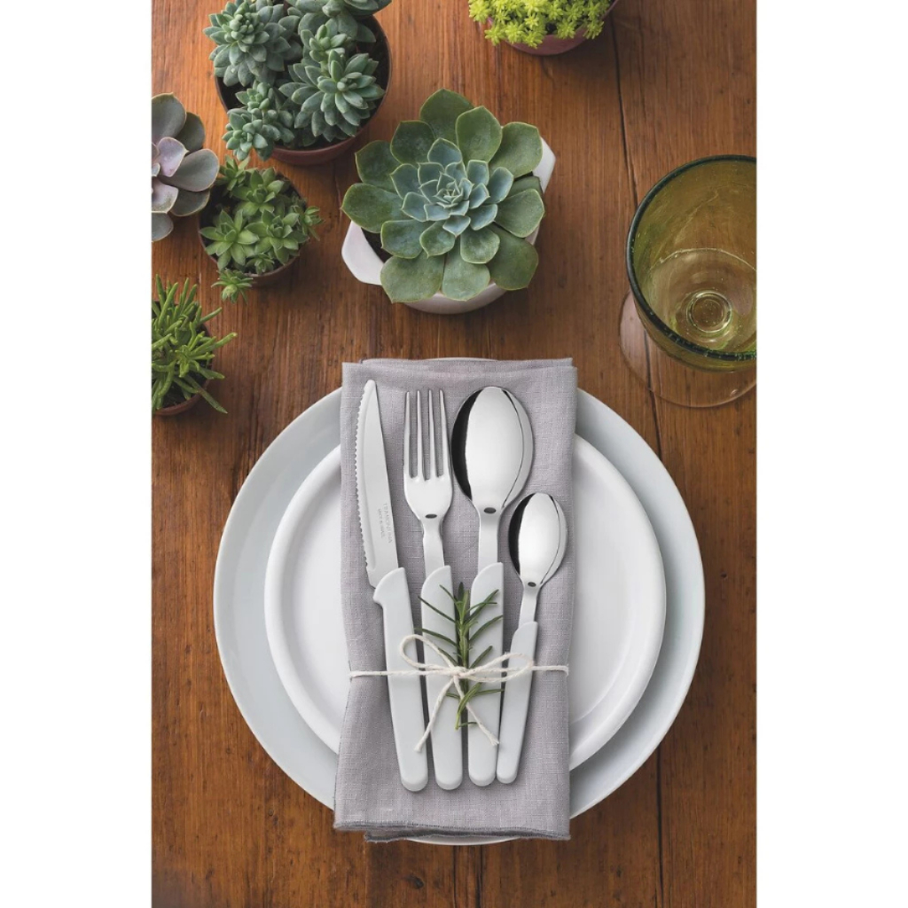 O Faqueiro Tramontina Carmel com Lâminas em Aço Inox e Cabos de Polipropileno Natural 24 Peças é feito para você que não abre mão da praticidade e da beleza. A linha Carmel traz para o dia a dia mais leveza, além de modernidade para a sua mesa. Extremamente bonito, garantindo que todas as ocasiões se tornem ainda mais especiais. O faqueiro conta com garfos, facas para churrasco, colheres e colheres de chá produzidas com lâminas em aço inox e espessura que mantém formas inalteradas mesmo com uso intenso. Os cabos são produzidos em polipropileno com diversas opções de cores, além disso, oferecem um manuseio confortável e seguro. O fio das facas tem maior durabilidade, pois as lâminas em aço inox recebem tratamento térmico. Seja na hora do almoço ou do jantar, a felicidade estará garantida. Podem ir à máquina de lavar louças facilitando seu dia a dia. Conteúdo do jogo: 06 Facas para Churrasco 4"; 06 Garfos de Mesa; 06 Colheres de Mesa; 06 Colheres para chá.