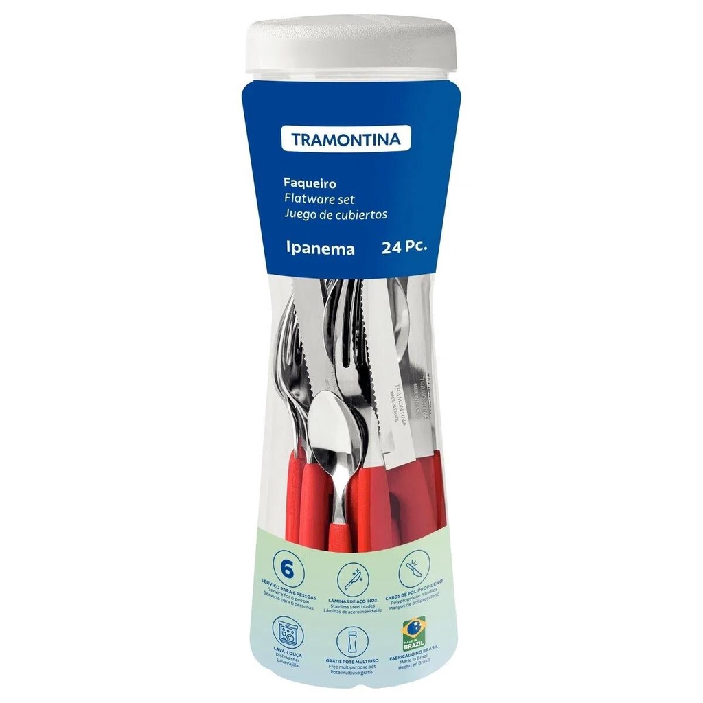 Faqueiro Tramontina Ipanema com Lâminas em Aço Inox Cabos de Polipropileno Vermelho com Pote Plástico 24 Peças 23399791