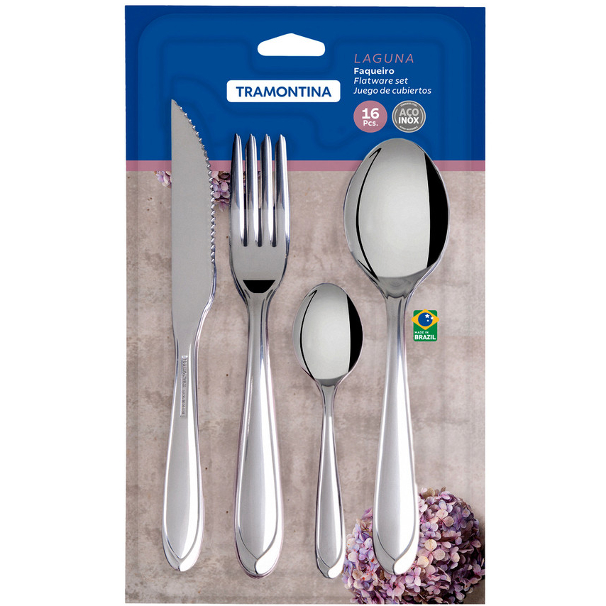 Faqueiro TRAMONTINA - Laguna - 16 peças - Aço Inox_x000d_ _x000d_ _x000d_ Peças totalmente feitas de aço inox, altamente duráveis, mantêm suas características originais, preservando a beleza, a higiene e a durabilidade do material._x000d_ _x000d_ Colheres com bojo em formato simétrico e bordas cuidadosamente arredondadas._x000d_ Garfos com dentes polidos na parte interna, com formato apropriado para a boca e bordas arredondadas para proporcionar maior conforto no uso._x000d_ Facas totalmente temperadas, que garantem maior durabilidade no fio de corte e maior resistência à corrosão, e por suas características de temperabilidade, não riscam as porcelanas._x000d_ _x000d_ Acabamento em brilho, com detalhes no cabo._x000d_ Próprias para uso diário combinam com qualquer ambiente._x000d_ _x000d_ Podem ser lavadas diariamente na máquina de lavar louças._x000d_ _x000d_ _x000d_ CONTEÚDO DO JOGO_x000d_ _x000d_ 4 Colher de Mesa Tramontina Laguna em Aço Inox / C. 19 cm X L. 4,3 cm X 2,10 cm. Peso: 40 gr._x000d_ 4 Faca para Churrasco Tramontina Laguna em Aço Inox / C. 21 cm X L. 1,8 cm X 0,3 cm. Peso: 43 gr._x000d_ 4 Garfo de Mesa Tramontina Laguna em Aço Inox / C. 19,30 cm X L. 2,3 cm X 1,90 cm. Peso: 31,5 gr._x000d_ 4 Colher para Chá Tramontina Laguna em Aço Inox / C. 12,80 cm X L. 3 cm X 1,4 cm. Peso: 14 gr._x000d_ _x000d_ _x000d_ _x000d_ GARANTIA_x000d_ 90 dias de garantia legal para vícios ou defeitos de fabricação._x000d_ _x000d_ _x000d_ _x000d_ RECOMENDAÇÕES DE USO_x000d_ _x000d_ Durante a lavagem, use apenas sabão ou detergente e uma esponja macia._x000d_ Outros tipos de produtos como palha de aço, poderão riscar ou prejudicar o brilho dos talheres._x000d_ Enxágue bem cada peça a fim de remover totalmente os resíduos dos produtos de limpeza,pois, por serem abrasivos, podem prejudicar o inox._x000d_ Sempre que possível, use água quente, pois renova o brilho do talher._x000d_ Após a lavagem, enxugue imediatamente os talheres, caso contrário, as substâncias químicas da água (cloro) poderão causar manchas._x000d_ Evite atrito entre os talheres durante o processo de lavagem e no armazenamento, para mantê-los sem riscos._x000d_ Evite o contato das peças com superfícies quentes._x000d_ Elas provocam a descoloração do produto._x000d_ Não guarde os talheres em locais úmidos._x000d_ A umidade também provoca manchas._x000d_ Ao usar a lava-louça, recomendamos retirar os talheres logo que tenha terminado o ciclo ''''enxaguar'''', a fim de que sejam secados manualmente._x000d_ _x000d_
