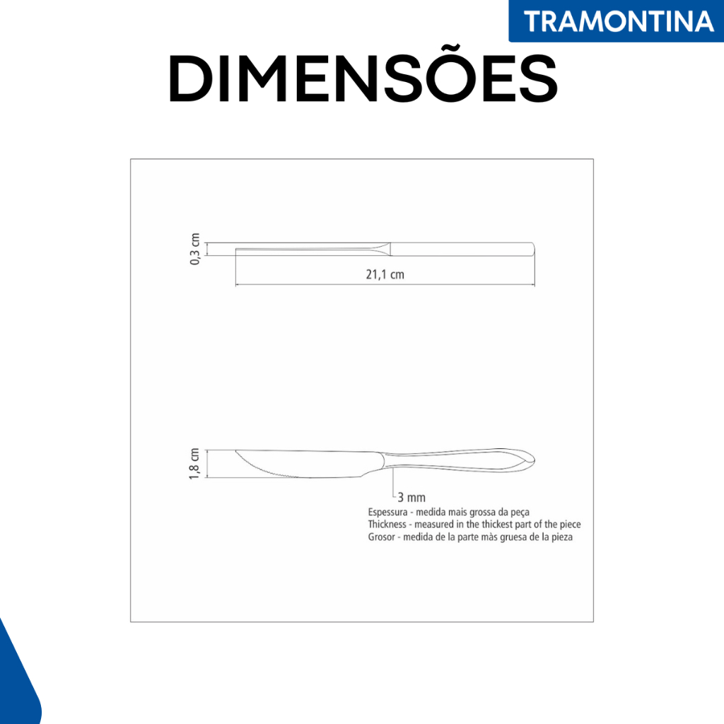 Jogo de talheres laguna 36 peças garfo faca e colher ideal para restaurante Kit com 12 garfos 12 facas e 12 colheres de sopa laguna inox CONTEÚDO: *12 FACAS DE CHURRASCO LAGUNA TRAMONTINA *12 GARFOS DE MESA LAGUNA TRAMONTINA *12 COLHERES DE MESA LAGUNA TRAMONTINA Garfo e Faca totalmente temperada, que garante maior durabilidade no fio de corte e maior resistência à corrosão, e por sua característica de temperabilidade, não risca as porcelanas. Totalmente feita de aço inox, mantém suas características originais, preservando a beleza, a higiene e a durabilidade do material. Acabamento em brilho, com detalhes no cabo. Própria para uso diário combina com qualquer ambiente. Pode ser lavada diariamente na máquina de lavar louças. Medidas da FACA > altura 0,3cm, largura 1,8cm, comprimento 21cm, peso 43g Medidas do GARFO> altura 0,19cm, largura 2,3cm, comprimento 19,3cm, peso 32g DESEJA UM KIT COM QUANTIDADE DIFERENTE? DEIXE NO CAMPO DE PERGUNTA QUE MONTAMOS