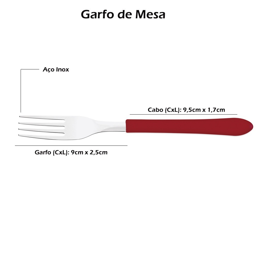 Garanta refeições cheias de estilo e uma mesa muito mais completa com o Faqueiro Tramontina Leme com Lâminas em Aço Inox e Cabos de Polipropileno Vermelho 20 Peças! Composto por peças essenciais para as principais refeições do seu dia. São produzidas com cabos em polipropileno na cor vermelho e com lâminas em aço inox altamente duráveis e resistentes. É ainda muito prático, fácil de limpar e pode ir à máquina de lavar louças, facilitando muito mais suas tarefas na cozinha. Deixe sua mesa mais colorida e agradável com os talheres Tramontina Leme! Informações: - Lâminas de aço inox. - As lâminas das facas têm maior durabilidade do fio devido ao tratamento térmico. - Os garfos e colheres garantem maior resistência devido a espessura do aço e a estampagem das lâminas. - Os cabos de polipropileno possuem maior resistência e durabilidade. - Podem ir à máquina de lavar louças facilitando seu dia a dia. Recomendações: - Antes da primeira utilização, lave bem as peças e seque-as. - Tenha cuidado ao manusear produtos cortantes e perfurantes e mantenha-os fora do alcance das crianças. - Para maior durabilidade dos produtos recomenda-se secar bem antes de guardar, mesmo após lavagem em máquina. - Para descarte dos produtos e embalagens siga as orientações de reciclagem vigentes. Itens Inclusos: 4 Facas para churrasco 4" 4 Garfos de mesa 4 Colheres de mesa 4 Garfos de sobremesa 4 Colheres de chá