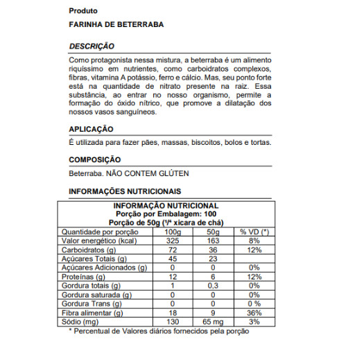 Farinha de Beterraba em Pó A farinha de beterraba em pó é um produto natural, rico em nutrientes, que pode ser usado para enriquecer receitas diversas, adicionando sabor, cor vibrante e benefícios à saúde. É uma excelente fonte de fibras, antioxidantes e vitaminas, ideal para quem busca uma alimentação mais saudável e funcional. ** Benefícios: - Rica em fibras e antioxidantes - Fonte de vitaminas essenciais - Adiciona cor e sabor natural às receitas - Versátil para uso culinário e suplementos - Produto natural e funcional ** Ficha Técnica: - Produto: Farinha de beterraba em pó - Ingredientes: 100% beterraba em pó - Uso: Culinária e suplementação - Origem: Natural *Imagem ilustrativa. O produto pode apresentar variações de cor, sabor e aparência, conforme as características naturais das matérias-primas e diferenças entre as safras do ano.